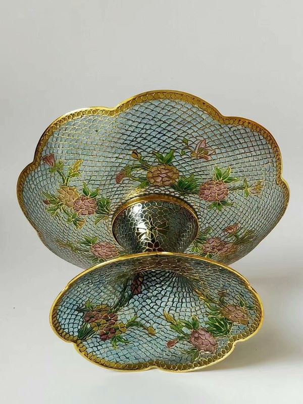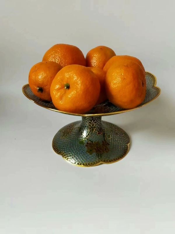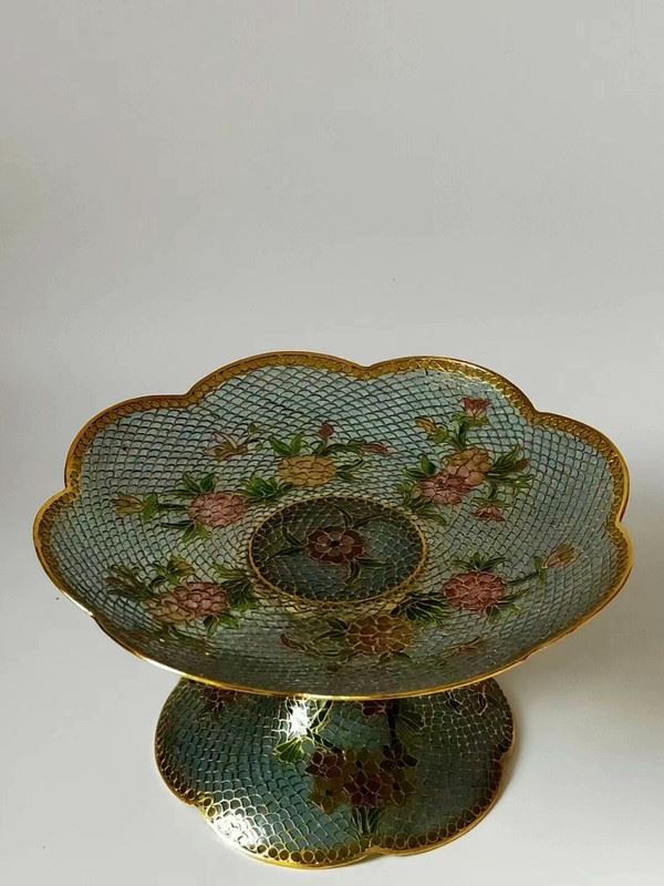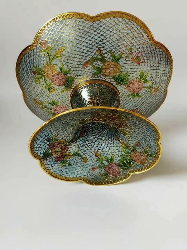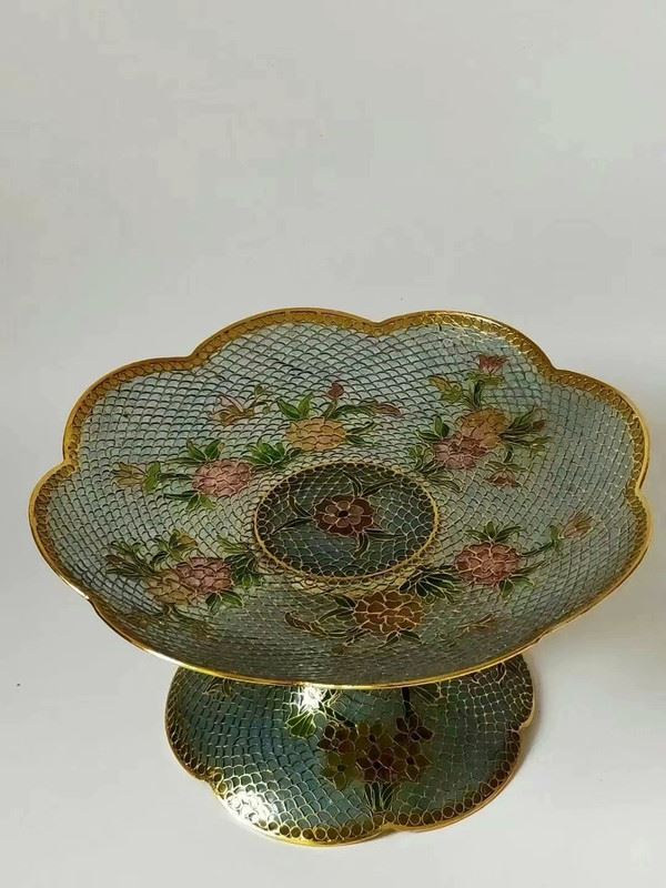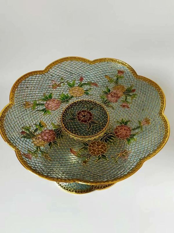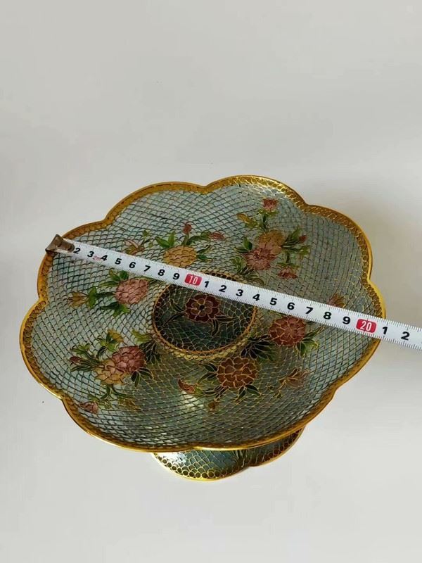 This is an exquisite cloisonné fruit plate, crafted using traditional cloisonné technique. The surface is adorned with delicate floral patterns in soft colors, with a golden rim accentuating its elegant outline. It is not only a work of art but also a practical decorative fruit plate, perfect for holding various fruits and adding a touch of sophistication to any home decor.