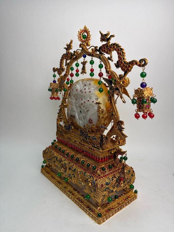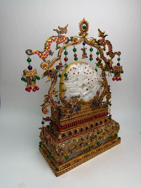 This cloisonné gilded inlaid Hetian jade landscape pavilion screen ornament showcases the essence of traditional Chinese art through its exquisite craftsmanship and rich cultural significance. The main body of the screen features cloisonné and gilded accents, incorporating elements of Hetian jade with landscape painting, portraying the harmonious beauty of pavilions and natural scenery. Every detail is meticulously crafted, and the fine Hetian jade inlays add elegance and opulence to the piece, reflecting the extraordinary craftsmanship of the Qing Dynasty and the grandeur of imperial art.