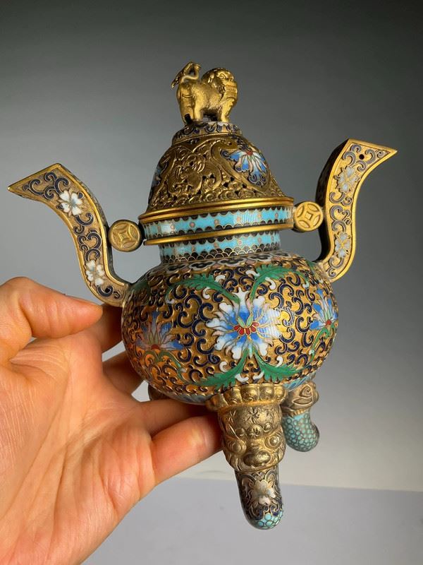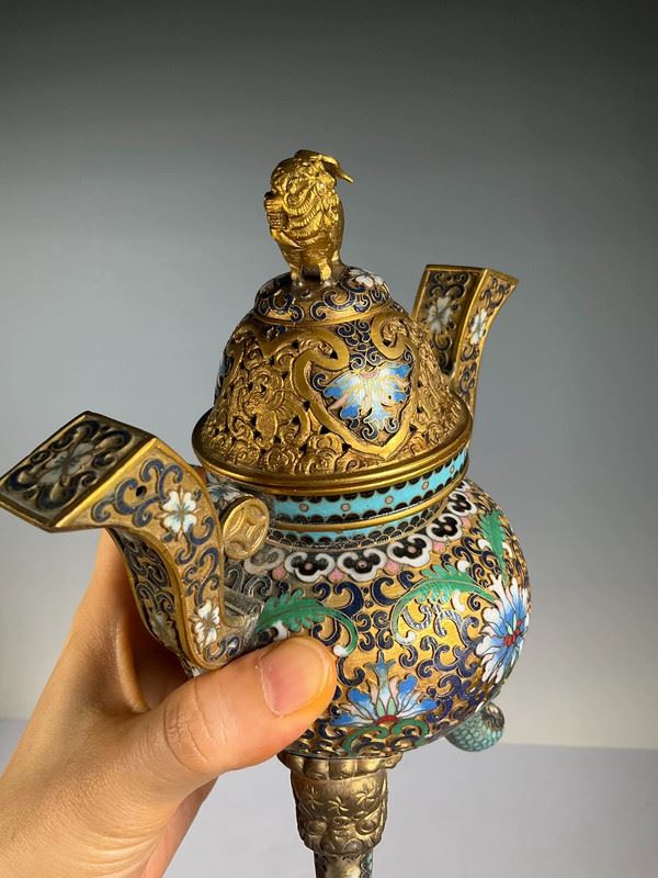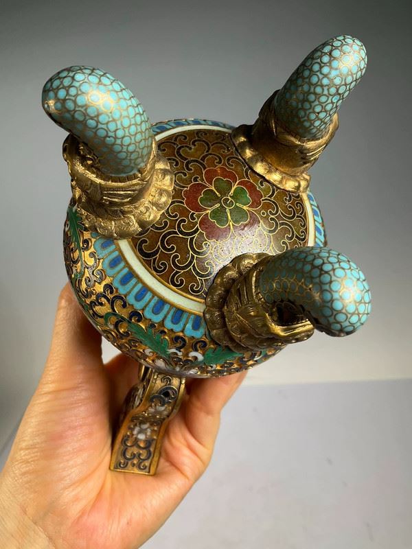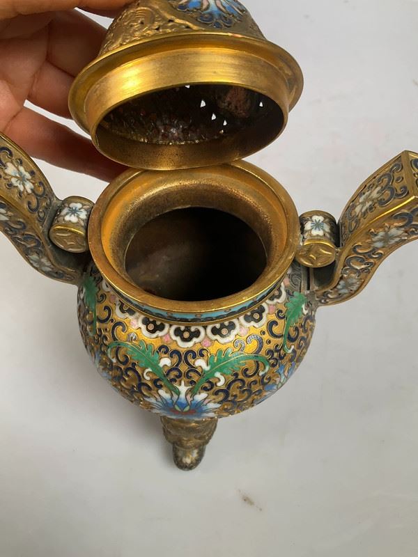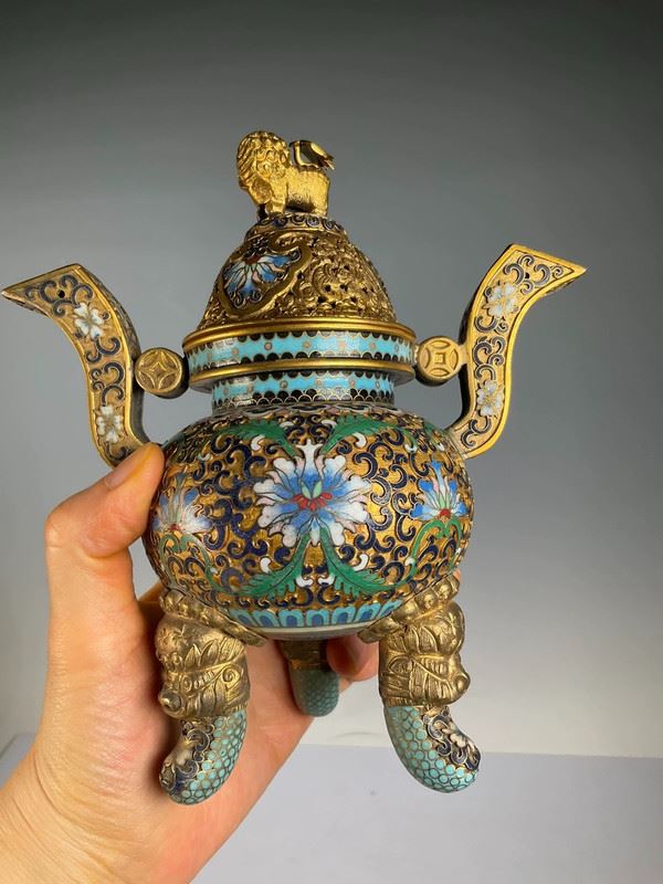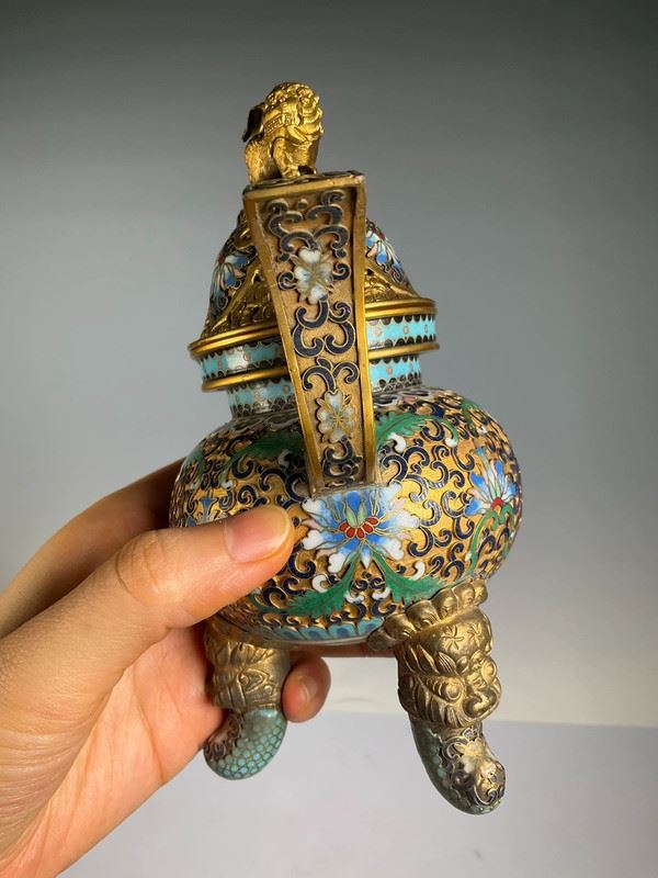 This exquisite cloisonné incense burner is crafted with a copper base and decorated with intricate floral patterns in vibrant enamel colors. The lid is topped with a gilt dragon finial, symbolizing auspiciousness and nobility. With its dignified form and refined details, this piece serves not only as a functional incense burner but also as a highly valuable work of art and a fine collectible.