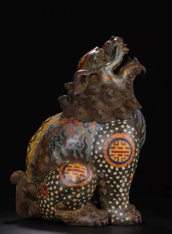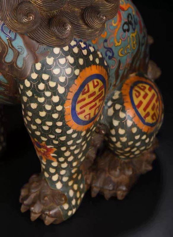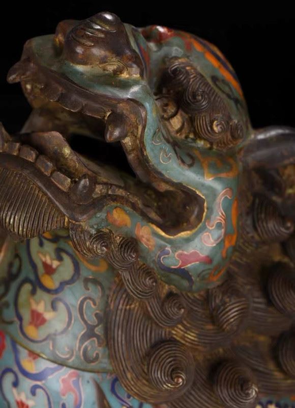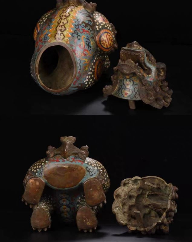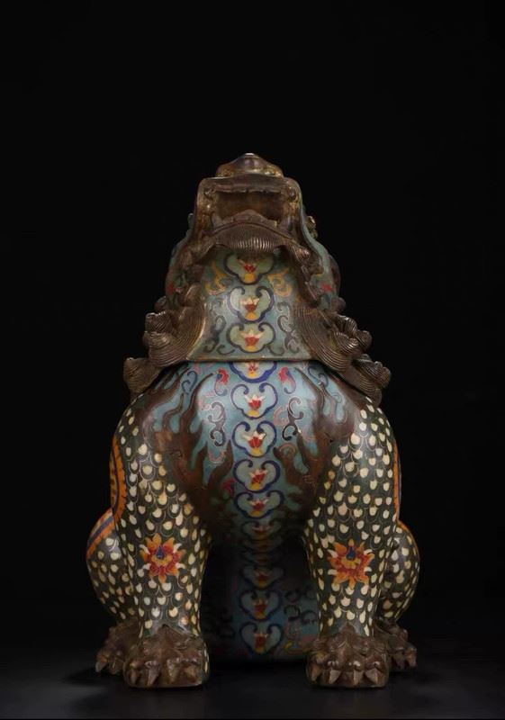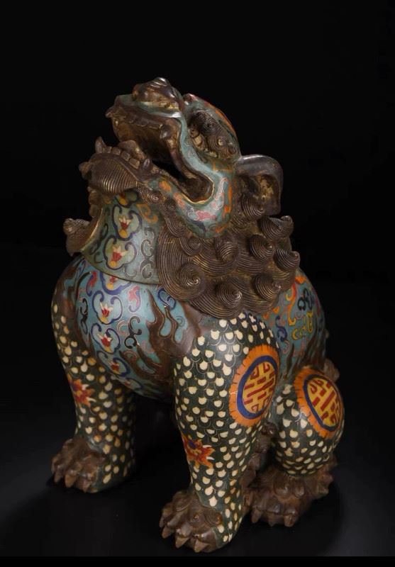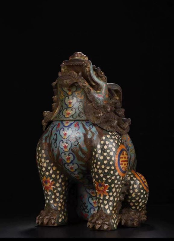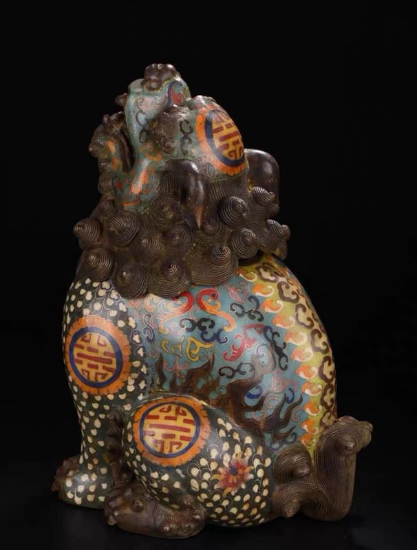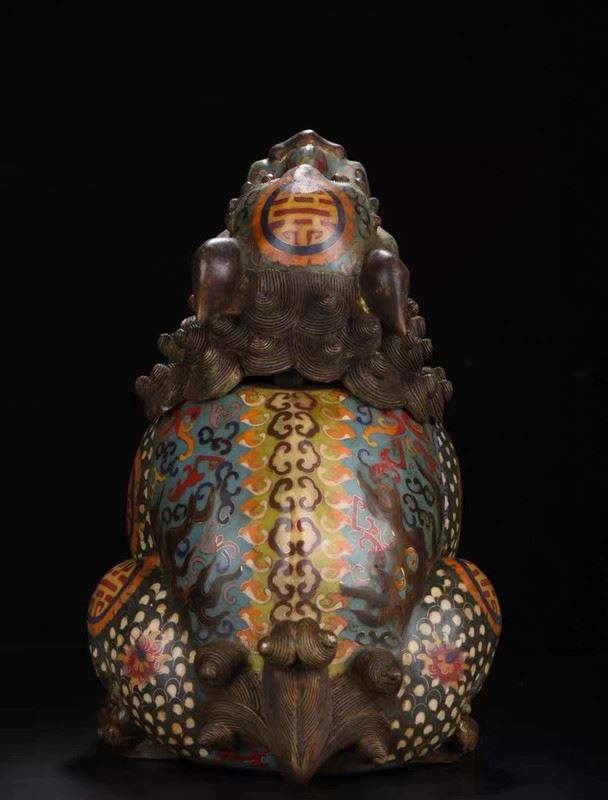 This cloisonné censer ornament is crafted with a copper body and decorated using the cloisonné enamel technique. Shaped as a guardian beast, it conveys a sense of majesty and symbolizes protection and good fortune. The body is richly adorned with vibrant enamels, cloud motifs, and “Shou” (longevity) symbols, representing prosperity and longevity. Serving both as a functional censer and a decorative piece, it holds significant artistic and collectible value.