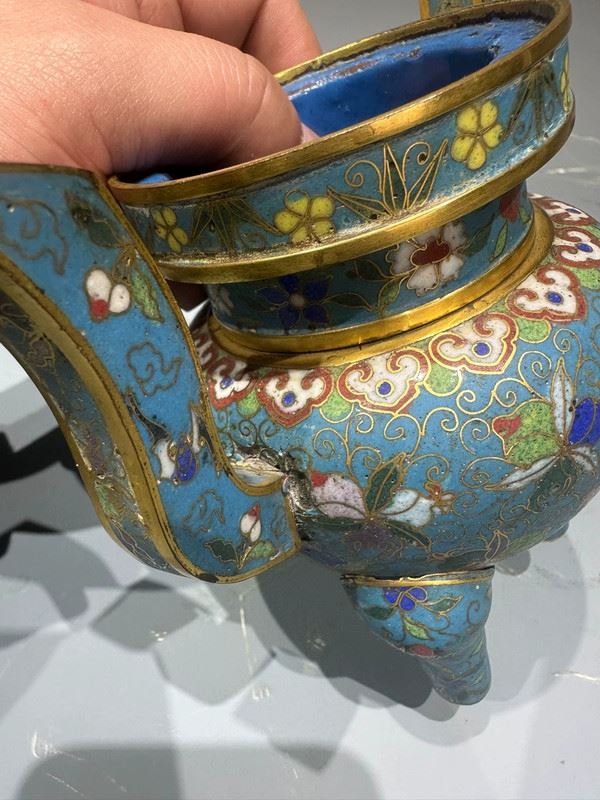 This cloisonné incense burner features a sky-blue ground richly decorated with scrolling floral and avian motifs, combining vibrancy with elegance. The tall, upward-curving handles add grace and dignity, while the three sturdy legs provide stability and strength. The gilt openwork cover allows ventilation, surmounted by a jewel-shaped finial that shines brilliantly. Serving both practical and decorative purposes, this incense burner is not only used for purifying spaces but also symbolizes prosperity and auspiciousness, making it a refined piece for ritual use and artistic collection.