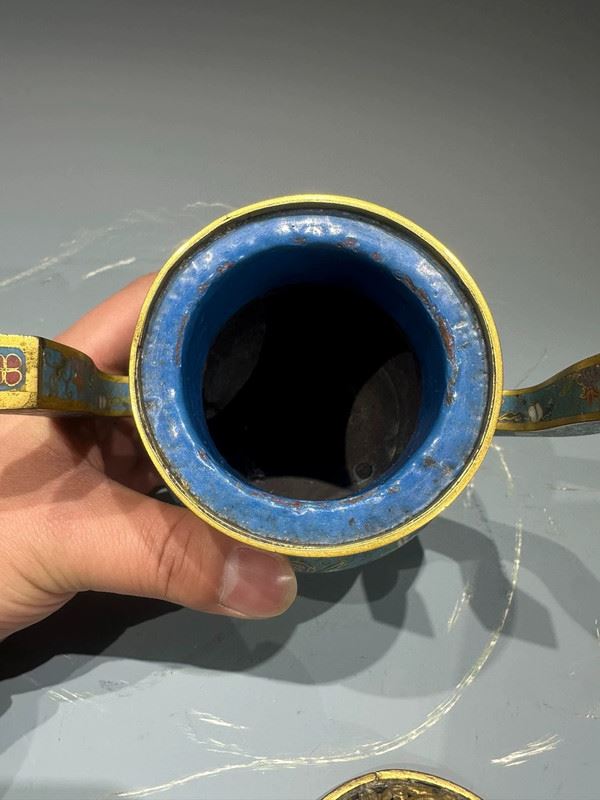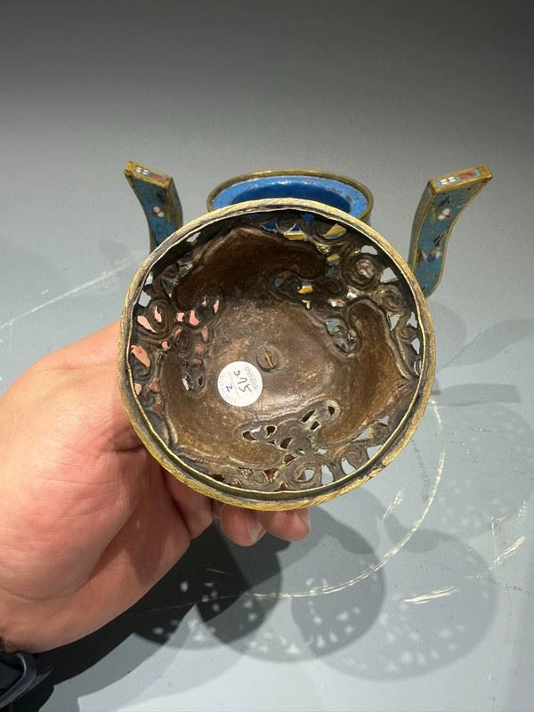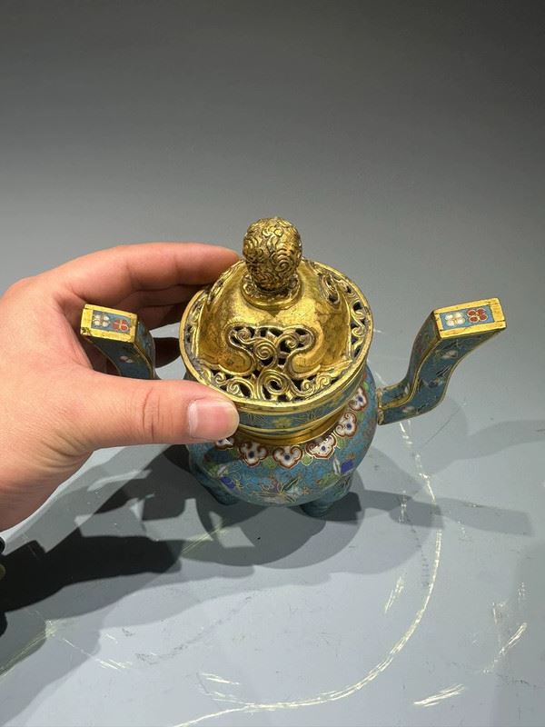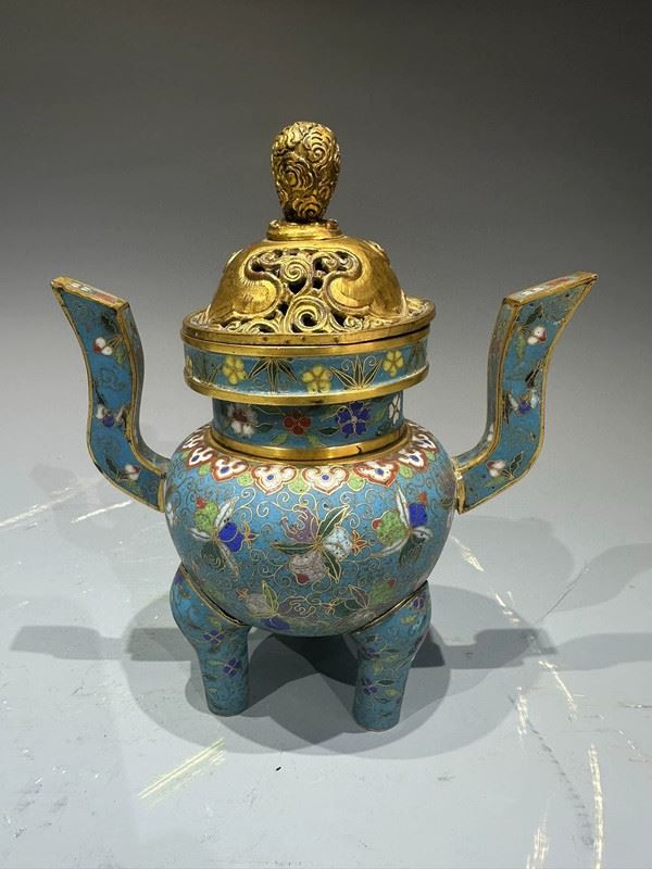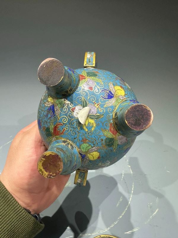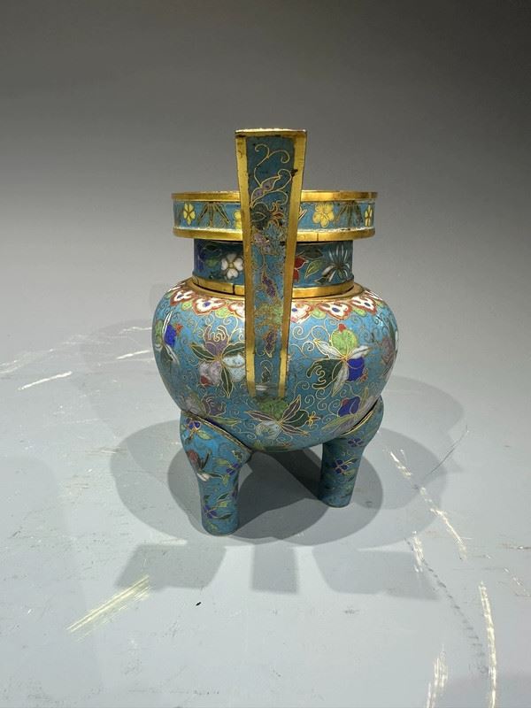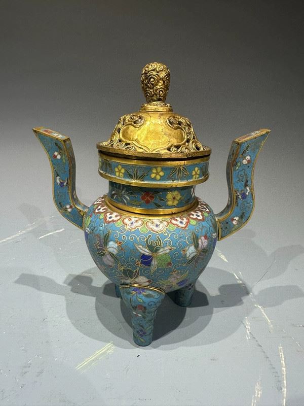 This cloisonné incense burner features a sky-blue ground richly decorated with scrolling floral and avian motifs, combining vibrancy with elegance. The tall, upward-curving handles add grace and dignity, while the three sturdy legs provide stability and strength. The gilt openwork cover allows ventilation, surmounted by a jewel-shaped finial that shines brilliantly. Serving both practical and decorative purposes, this incense burner is not only used for purifying spaces but also symbolizes prosperity and auspiciousness, making it a refined piece for ritual use and artistic collection.