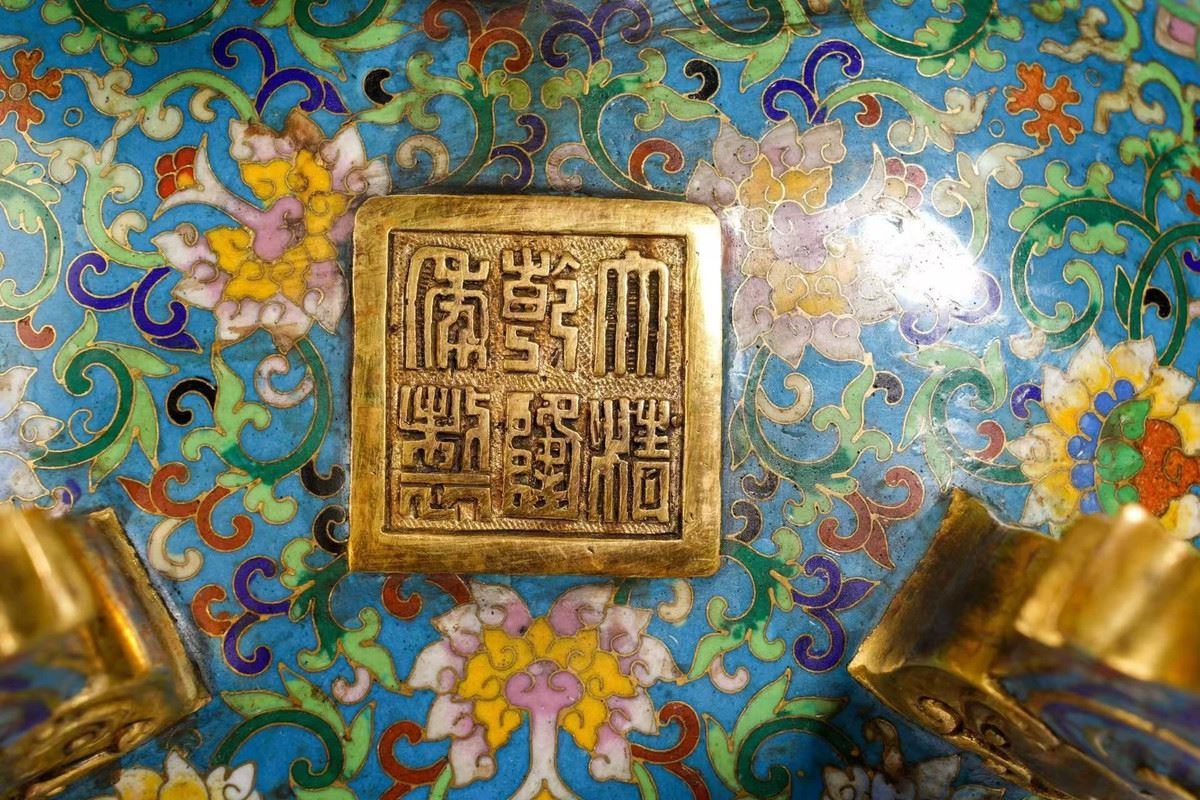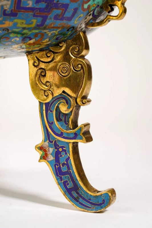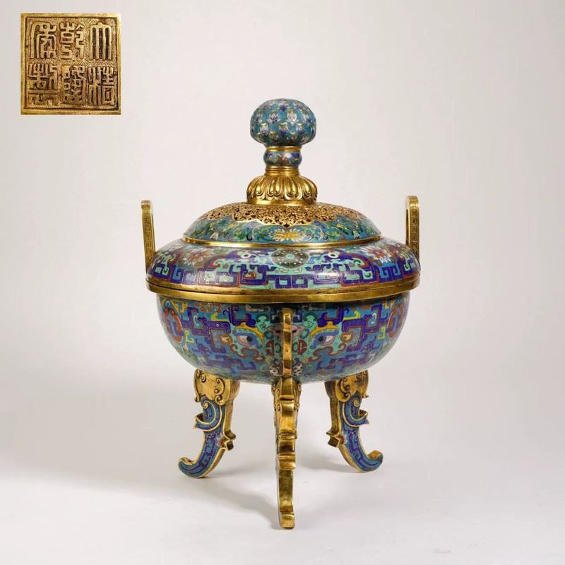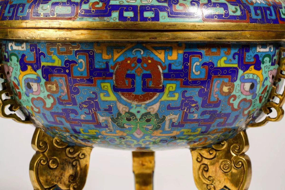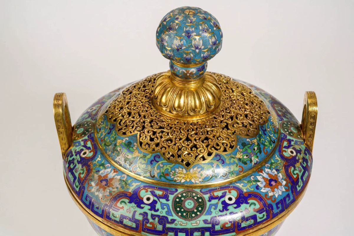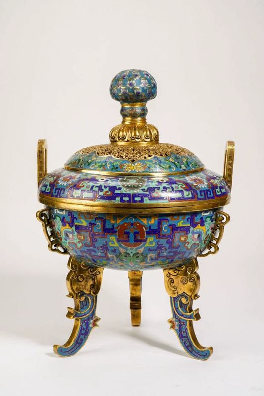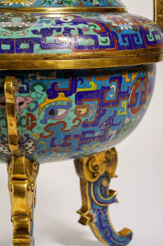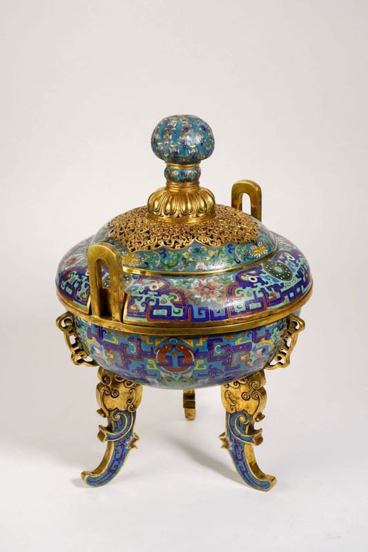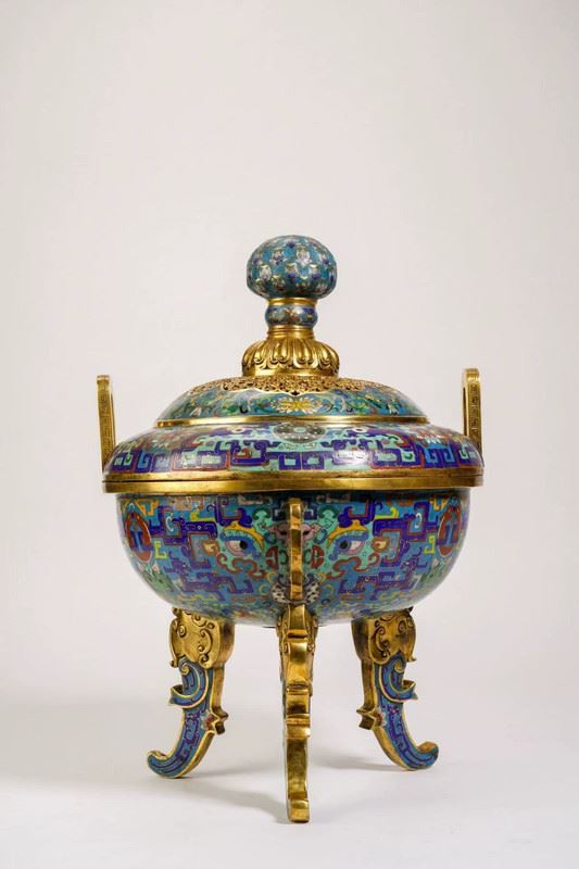 This cloisonné incense burner with gilded bronze showcases exquisite cloisonné craftsmanship, with intricate patterns and vibrant colors beautifully displayed on the metal surface. The golden base and decorative feet add an elegant touch, reflecting the refinement and delicacy of traditional artistry. The combination of design and color evokes a strong sense of ancient Chinese artistic charm.