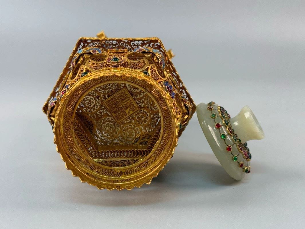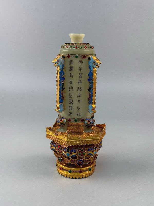 This cloisonné inlaid Hetian jade cylindrical vessel showcases exceptional craftsmanship and exquisite design from the Qing Dynasty court art. The body of the vessel is intricately carved from Hetian jade, featuring finely detailed inscriptions with significant historical and cultural value. The surrounding cloisonné inlay, adorned with vibrant gemstones and jade, adds luxury and dimension to the piece. The unique base design, decorated with metalwork and gemstones, elevates the entire artwork, combining functionality with high collectible value, and epitomizing the fusion of traditional craftsmanship and aesthetics.
