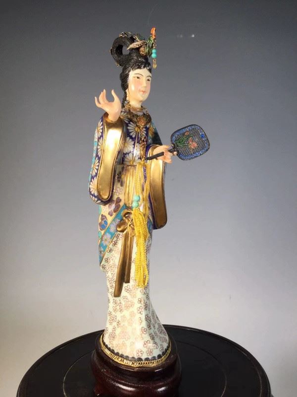 This cloisonné lady figurine showcases the elegance of a classical beauty through exquisite cloisonné craftsmanship. The lady is dressed in a magnificent gown adorned with vibrant cloisonné patterns, rich in colors and detail. Her graceful posture, holding a silk ribbon and fan, reflects refinement and traditional charm. With delicate features and finely executed details, the figurine embodies elegance and artistry, making it both a decorative masterpiece and a valuable collectible.