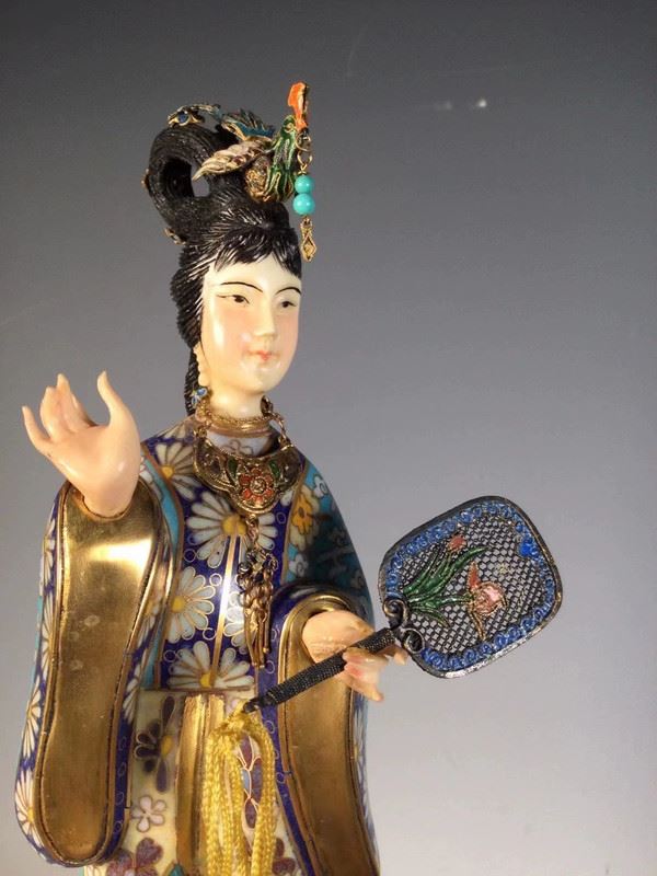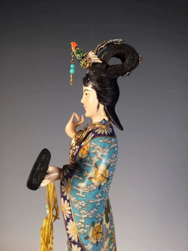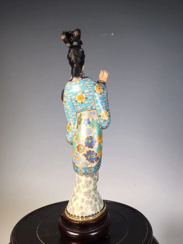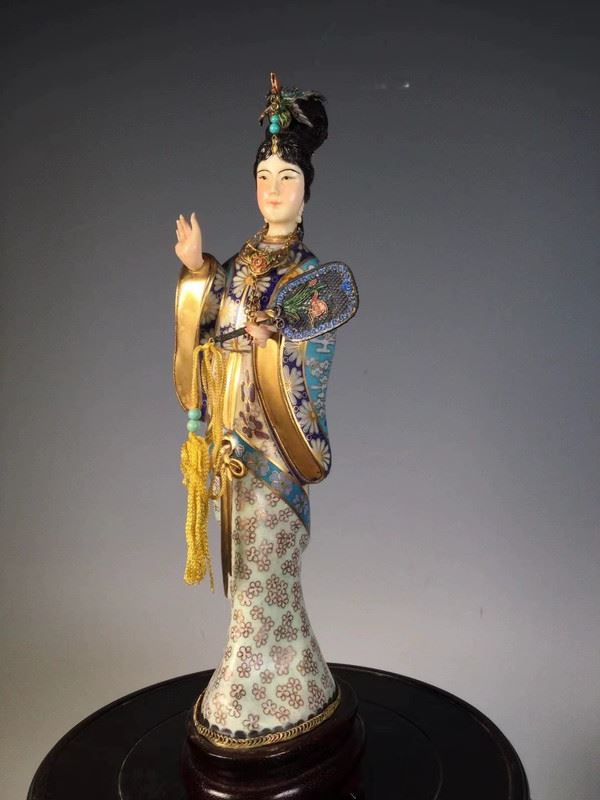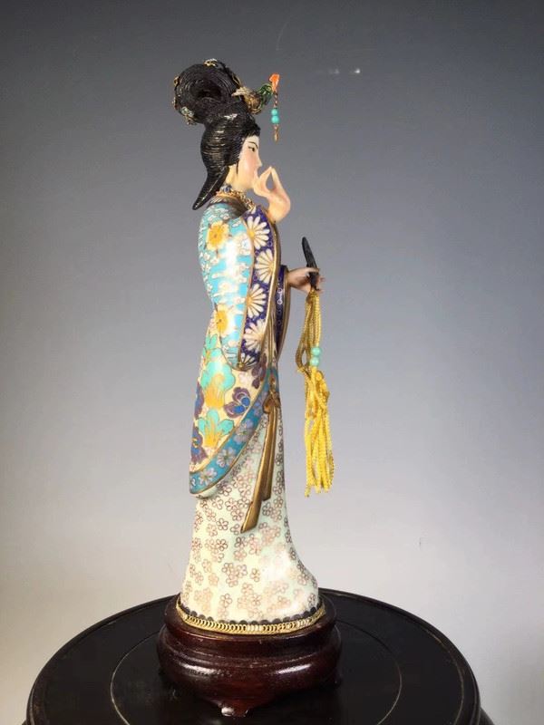 This cloisonné lady figurine showcases the elegance of a classical beauty through exquisite cloisonné craftsmanship. The lady is dressed in a magnificent gown adorned with vibrant cloisonné patterns, rich in colors and detail. Her graceful posture, holding a silk ribbon and fan, reflects refinement and traditional charm. With delicate features and finely executed details, the figurine embodies elegance and artistry, making it both a decorative masterpiece and a valuable collectible.