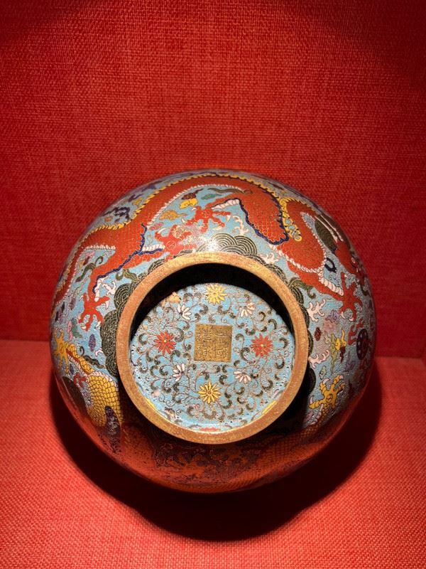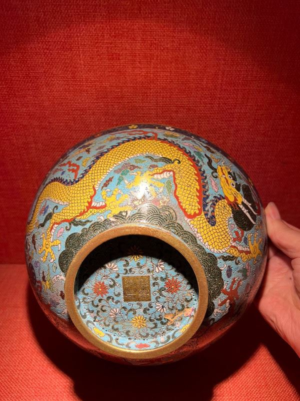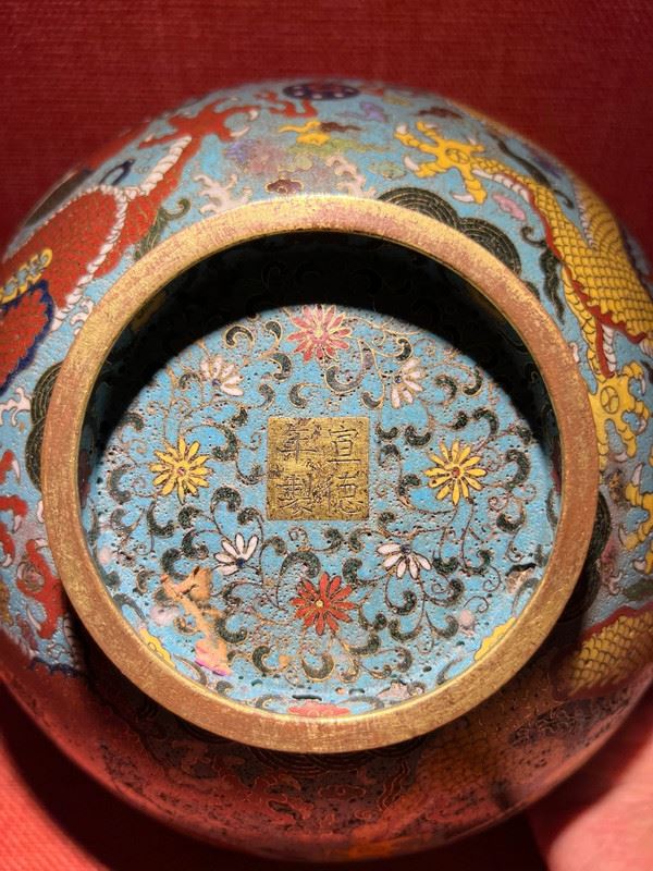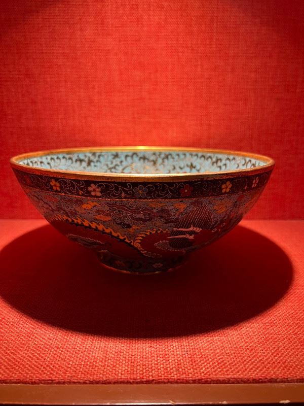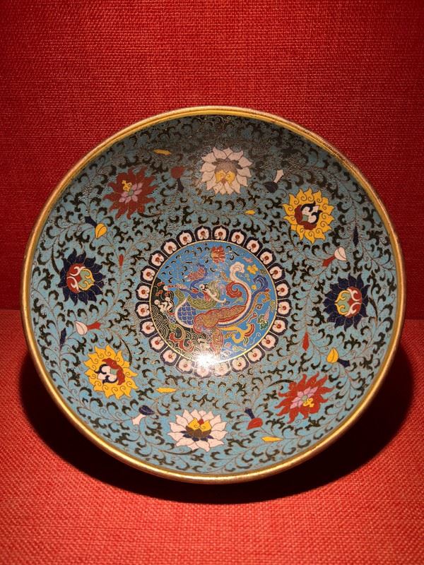 This cloisonné large bowl exemplifies superb craftsmanship and vibrant artistry, carrying a strong imperial style. At the center, a phoenix with outstretched wings symbolizes auspiciousness and nobility. Surrounding the interior are motifs of blooming flowers such as lotuses and peonies, accompanied by scrolling patterns, all rendered in vivid and layered colors. The turquoise enamel ground contrasts beautifully with the gilt rim, enhancing its elegance and magnificence. The fine filigree lines and rich enamel tones highlight the mastery of traditional cloisonné workmanship. This large bowl serves not only as a functional vessel but also as a remarkable art piece with great collectible value.