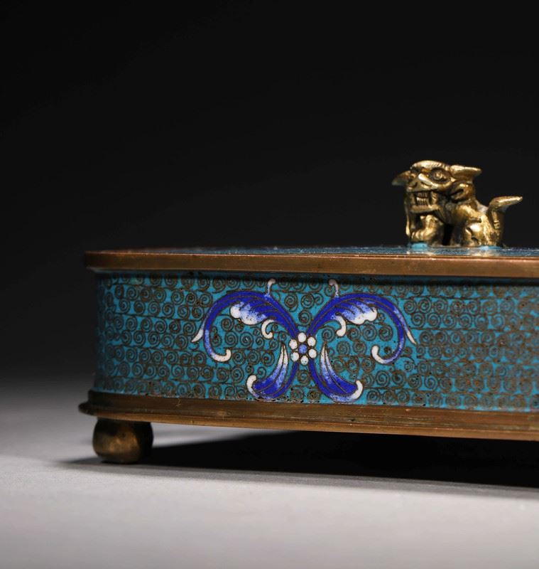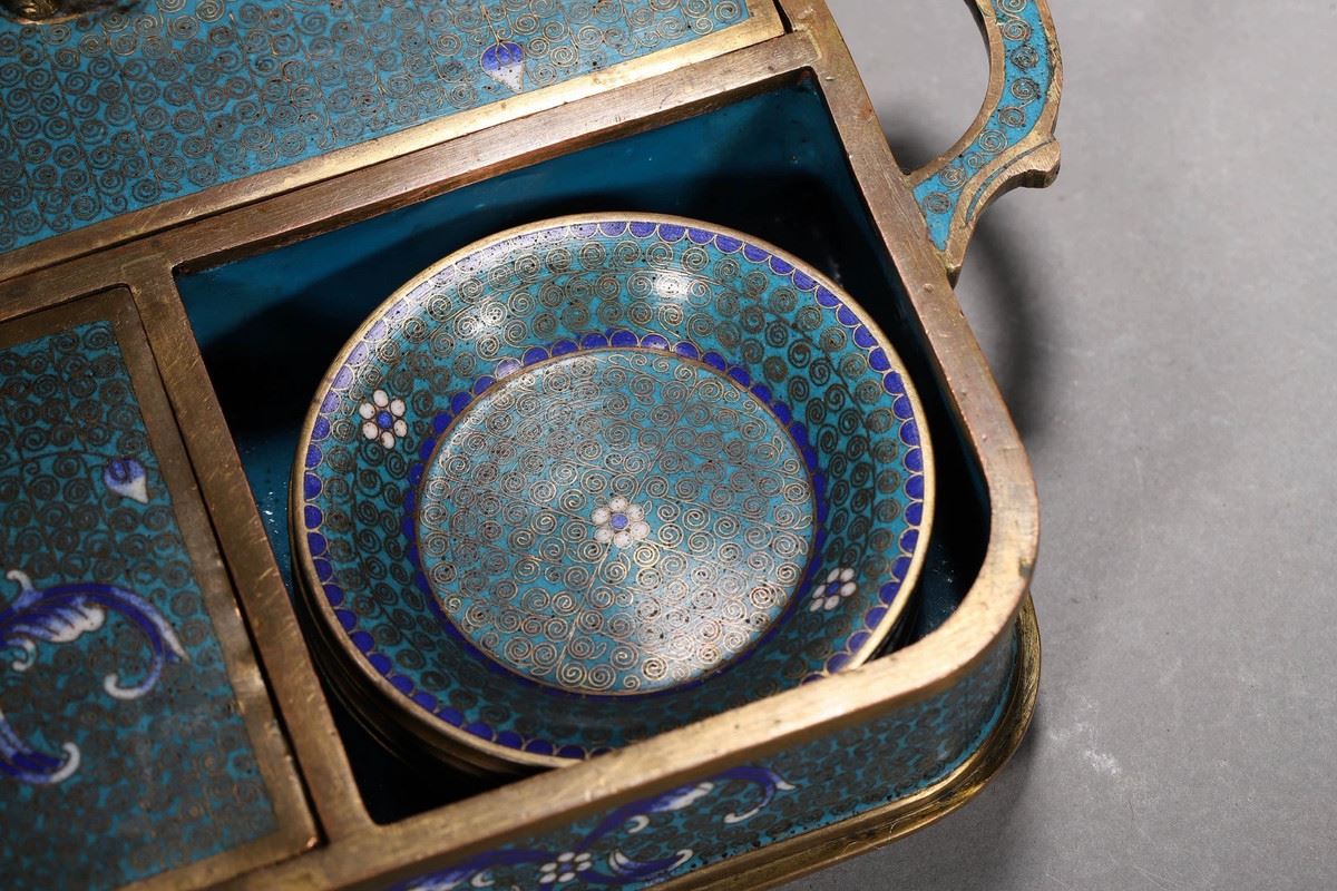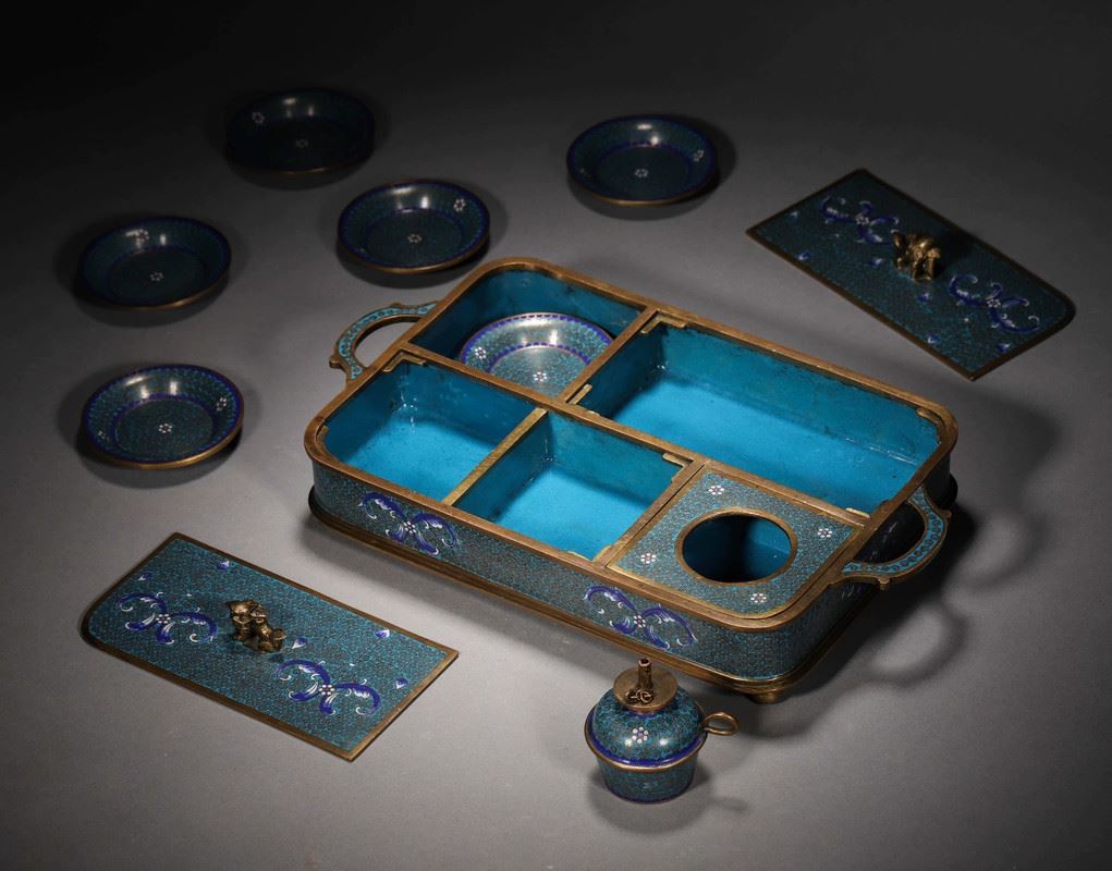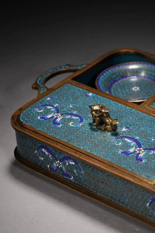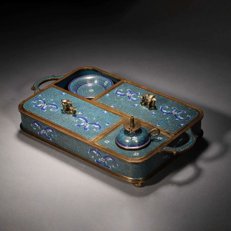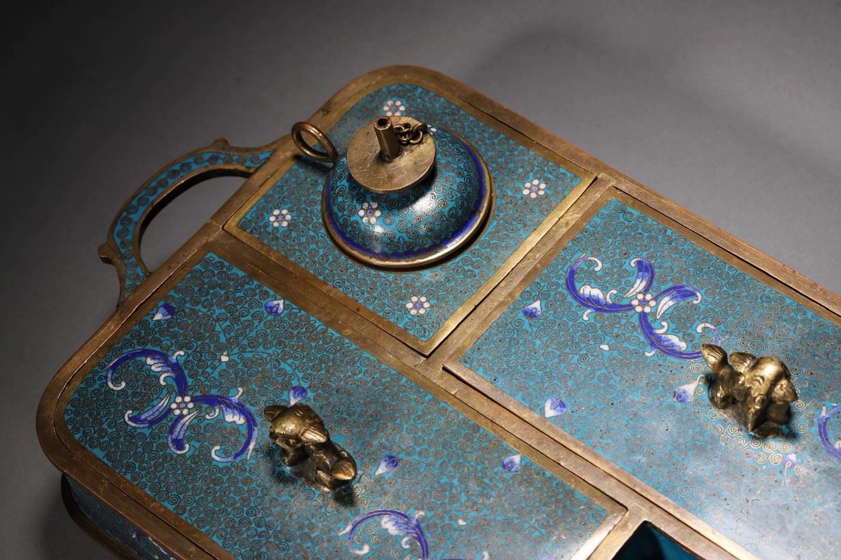 This smoking set, crafted in cloisonné on a copper body, features a turquoise-blue ground adorned with lotus scroll motifs. The structure includes compartments for the censer, bowl, and storage, reflecting both functionality and refined artistry. It exemplifies the elegance and craftsmanship of Qing dynasty decorative objects.