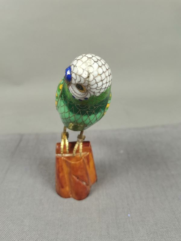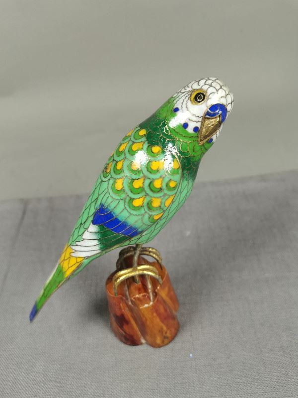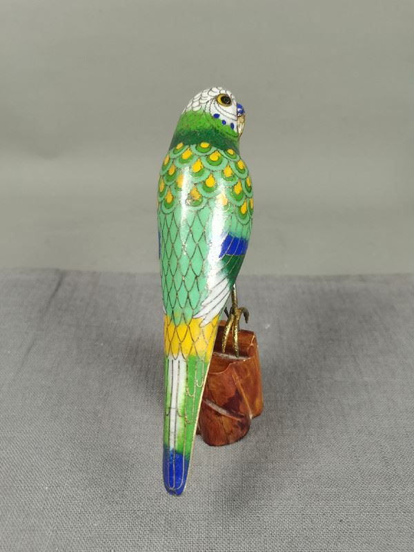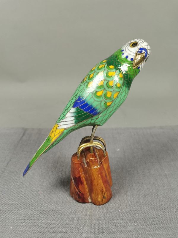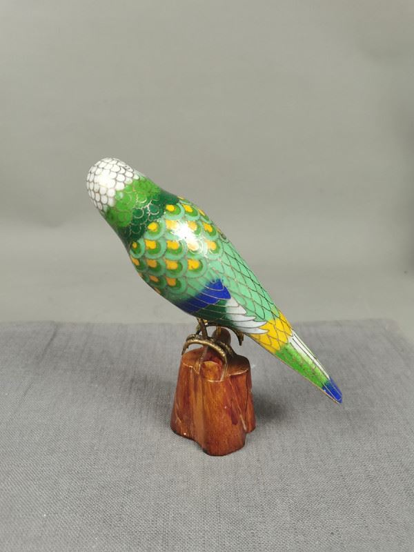 This vibrant cloisonné sculpture depicts a beautifully detailed parrot perched on a wooden base. The bird's intricate feather patterns, featuring shades of green, blue, and yellow, showcase the precision of cloisonné artistry. The parrot's bright eyes and graceful stance bring it to life, making it a striking piece for any collector.