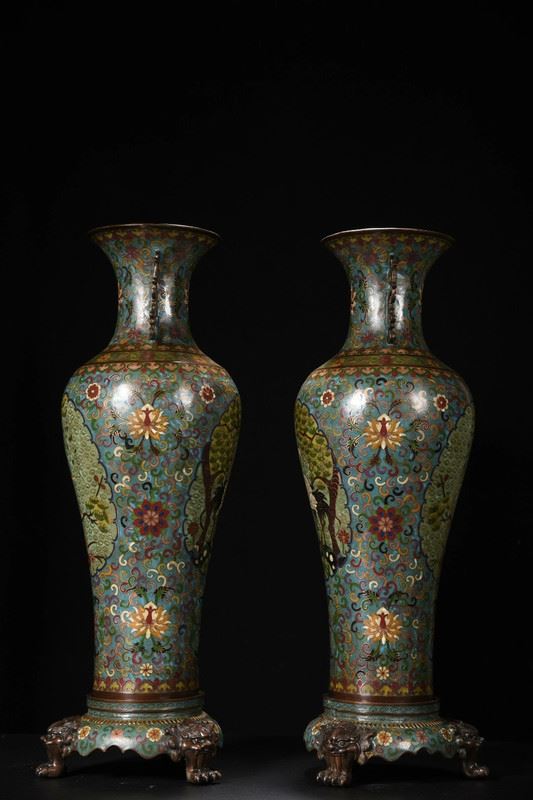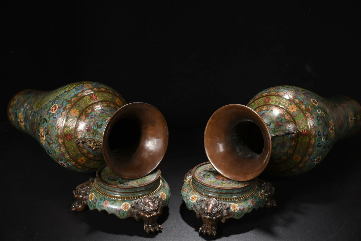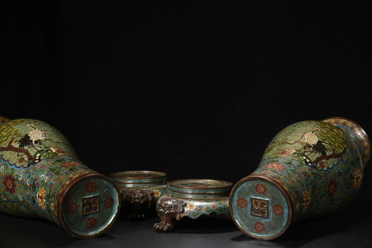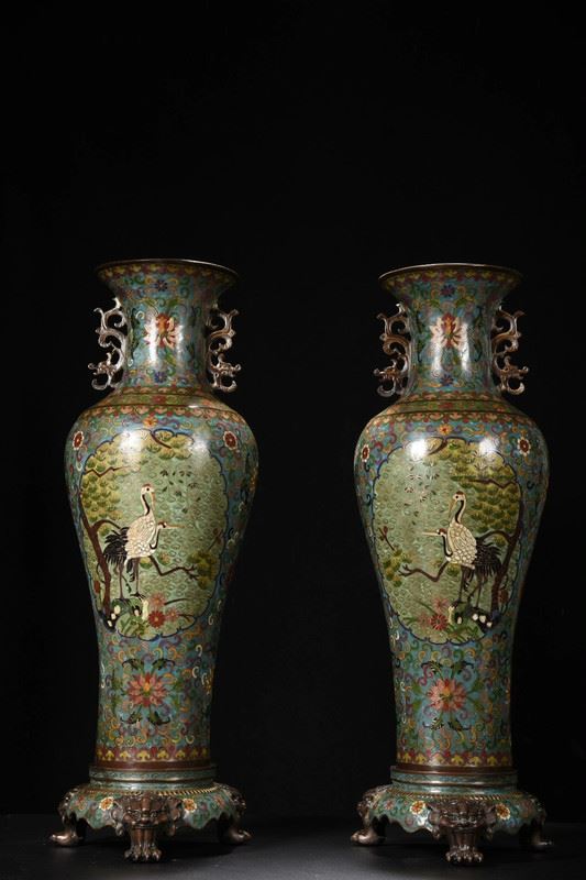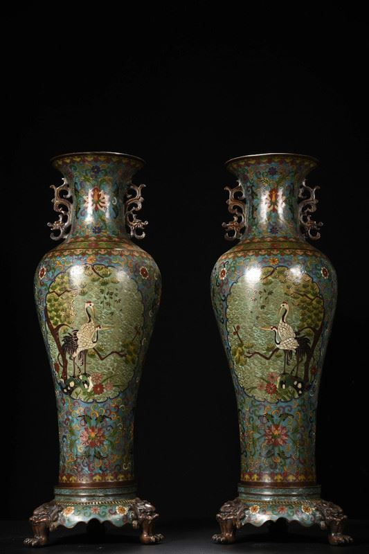 This pair of cloisonné "Pine and Crane Longevity" dragon-eared vases showcases exquisite cloisonné craftsmanship and profound cultural symbolism. The vases feature a classic design of pine trees and cranes, symbolizing longevity and good fortune. The vibrant colors, with a blend of green and blue as the base, are complemented by vivid floral motifs, while the fine golden details bring the design to life. The gilded rims and dragon-eared base add regal elegance to the overall appearance. The elegant design reflects the grandeur of royal art and makes this pair a highly collectible masterpiece.