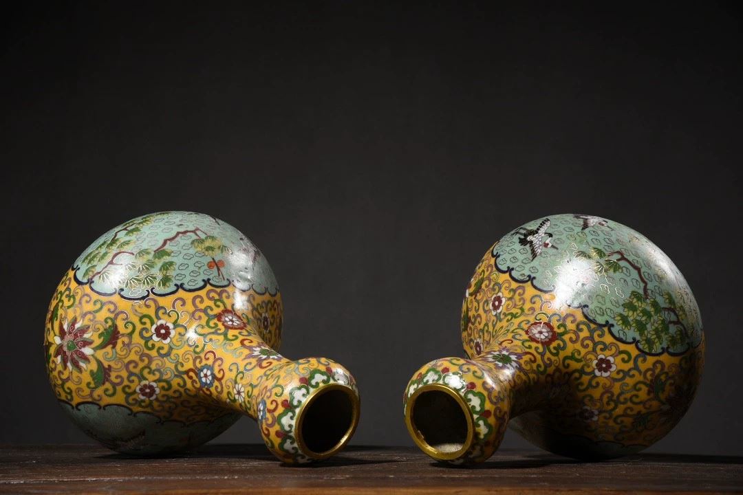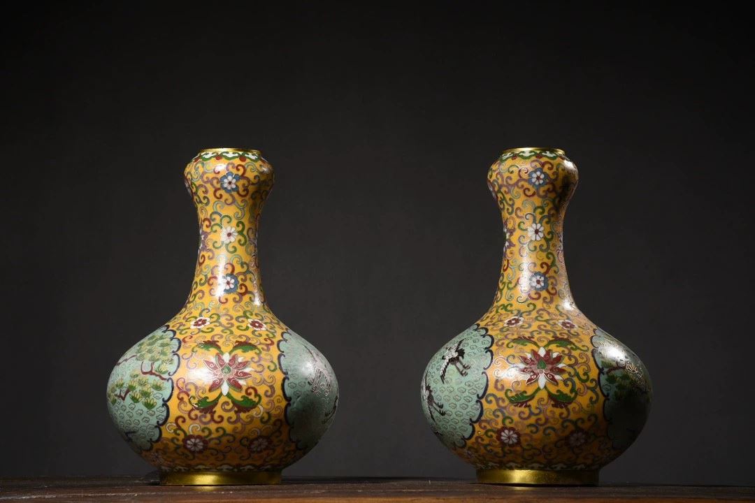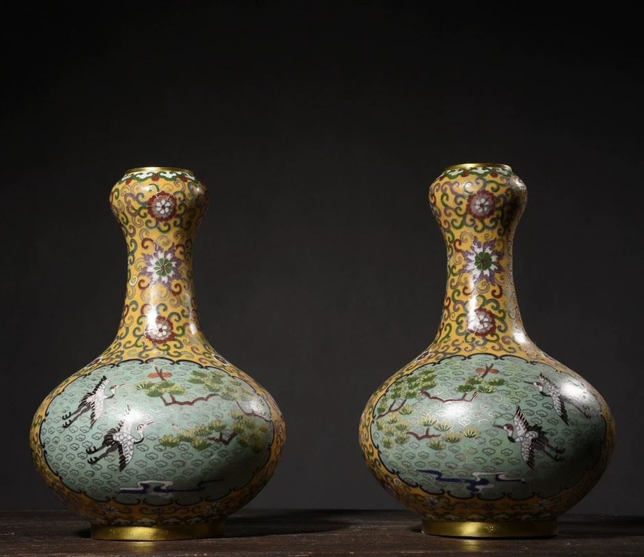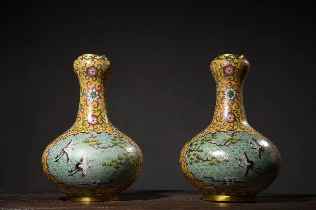 This pair of cloisonné "Pine and Crane Longevity" garlic-head vases showcases exquisite enamel craftsmanship combined with profound symbolic meaning. The vases feature a green background adorned with vivid pine and crane motifs, symbolizing longevity and good fortune. The gilded accents on the rim and base add a touch of elegance, while the golden and green colors harmonize to create a refined, graceful aesthetic. The pine and crane design conveys the wishes for health and longevity, and the unique shape of the vases reflects traditional garlic-head vase aesthetics. This pair is not only a decorative masterpiece but also a highly valuable collectible, showcasing the artistry of cloisonné and the depth of Chinese cultural traditions.