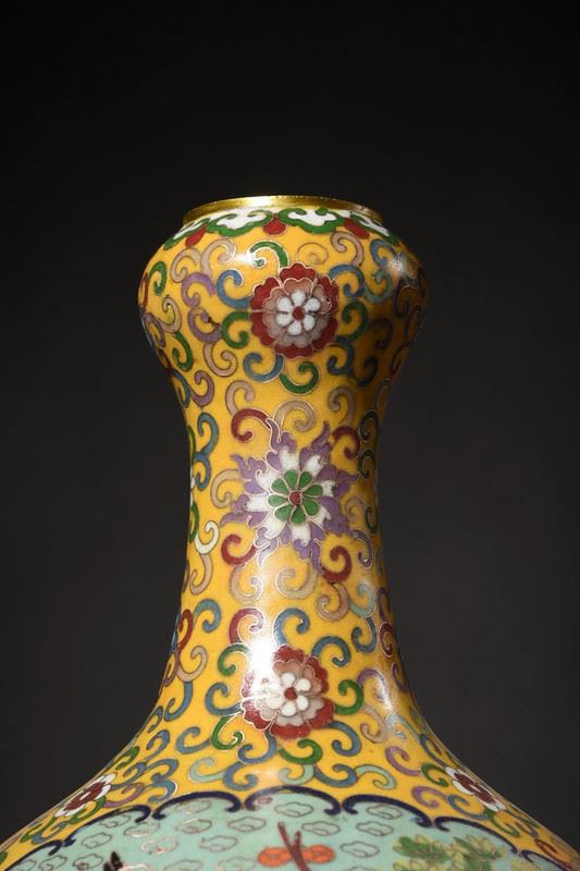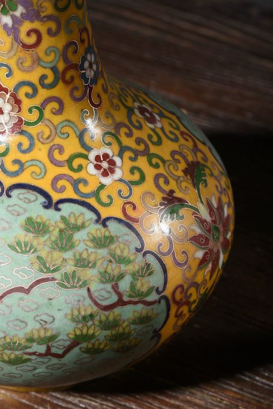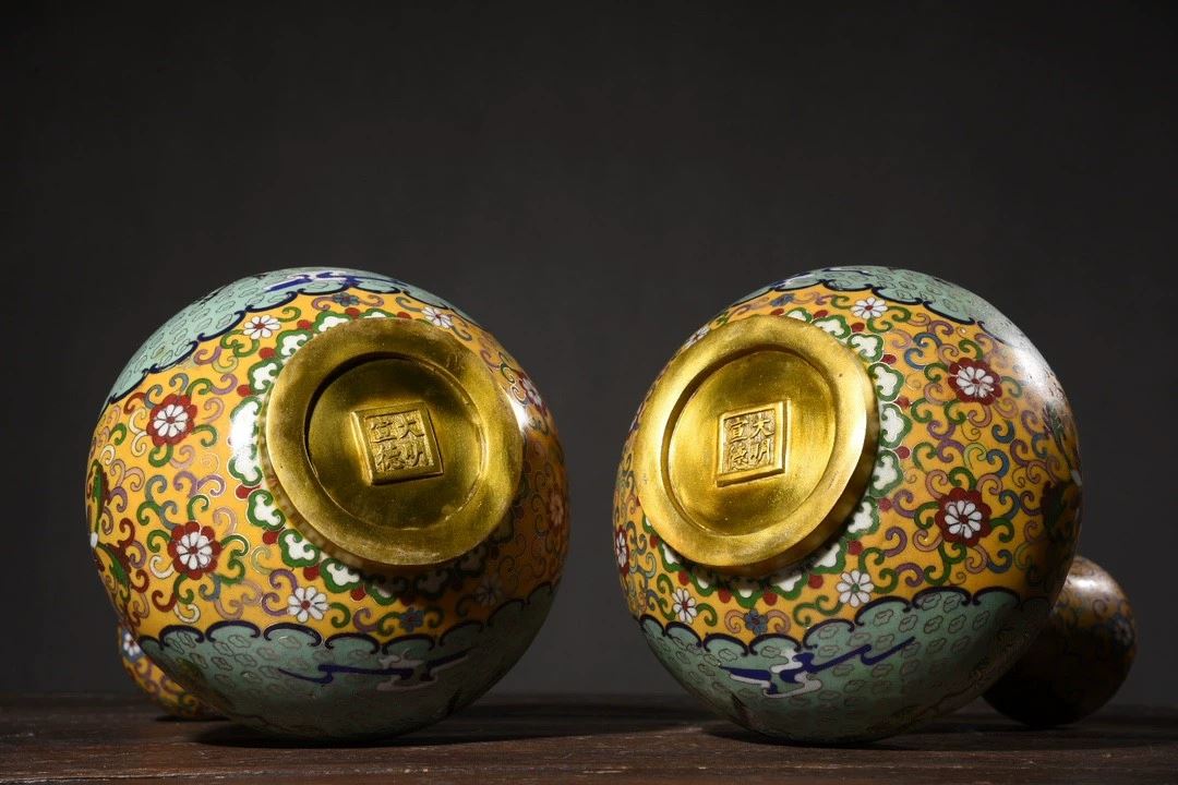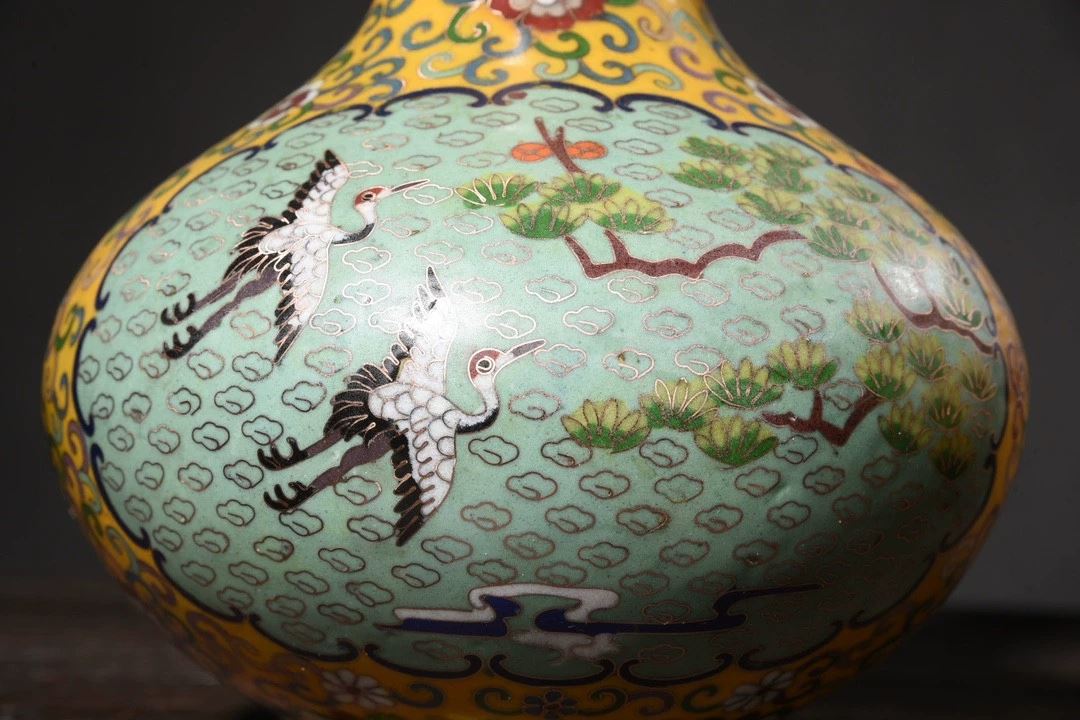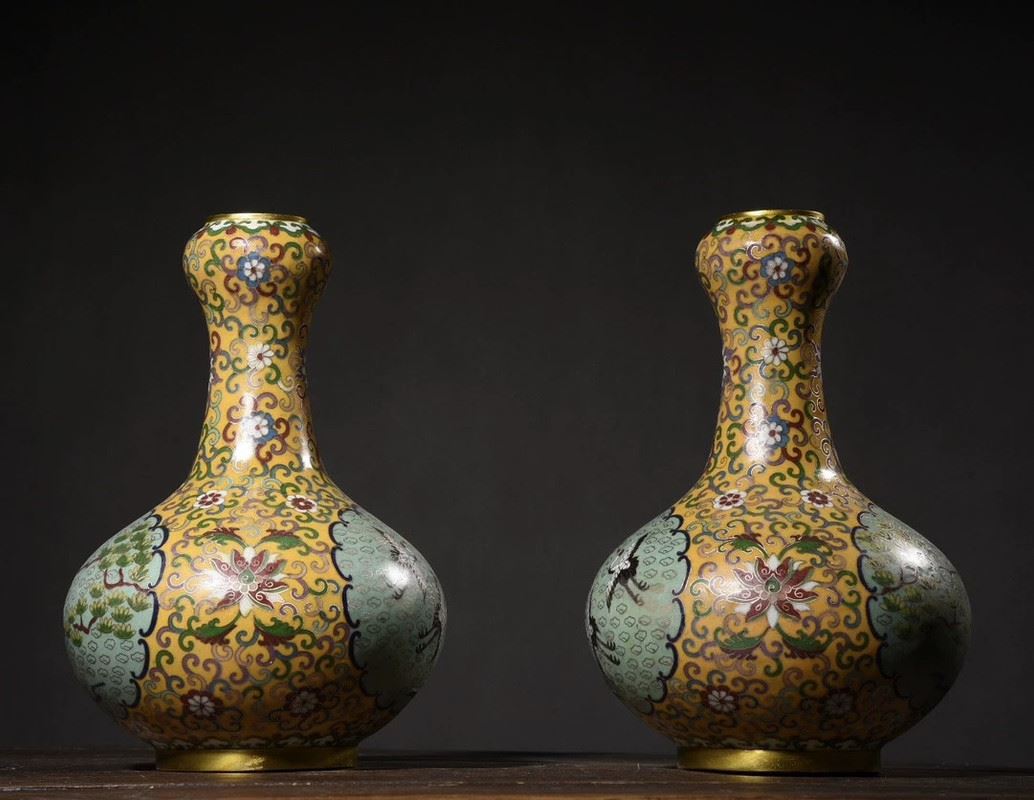 This pair of cloisonné "Pine and Crane Longevity" garlic-head vases showcases exquisite enamel craftsmanship combined with profound symbolic meaning. The vases feature a green background adorned with vivid pine and crane motifs, symbolizing longevity and good fortune. The gilded accents on the rim and base add a touch of elegance, while the golden and green colors harmonize to create a refined, graceful aesthetic. The pine and crane design conveys the wishes for health and longevity, and the unique shape of the vases reflects traditional garlic-head vase aesthetics. This pair is not only a decorative masterpiece but also a highly valuable collectible, showcasing the artistry of cloisonné and the depth of Chinese cultural traditions.