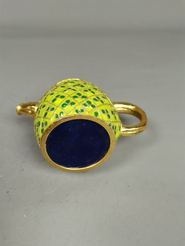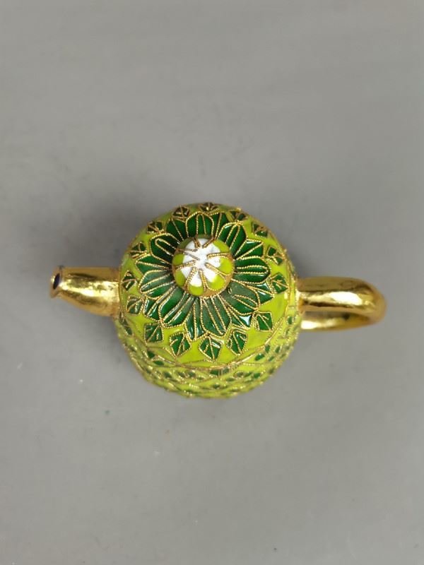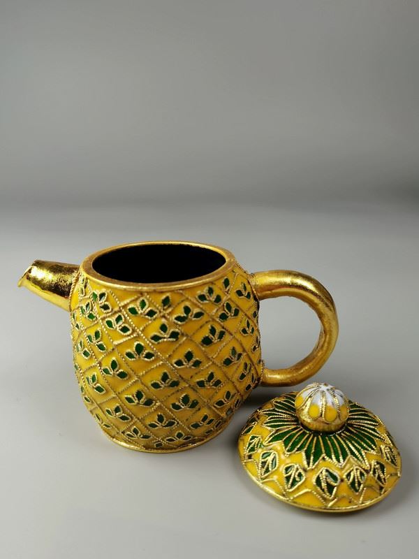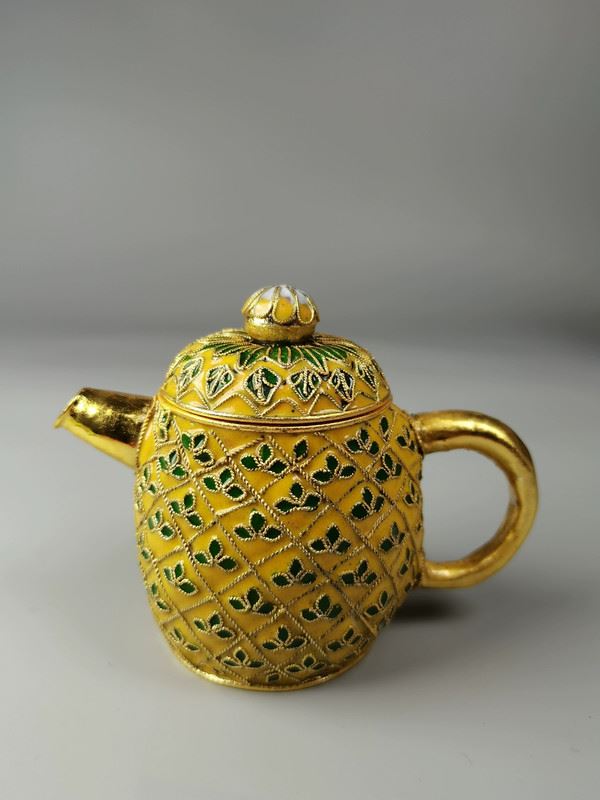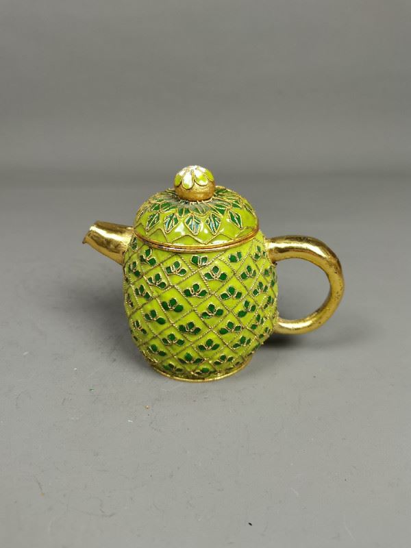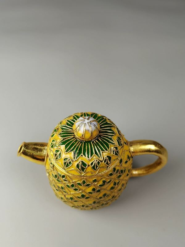 This exquisite cloisonné teapot is designed in the shape of a pineapple, with intricate patterns in vibrant yellow and green. The detailed craftsmanship showcases a fine combination of cloisonné artistry and botanical design, making it a unique and eye-catching piece perfect for any collection.