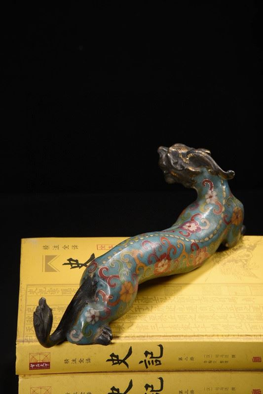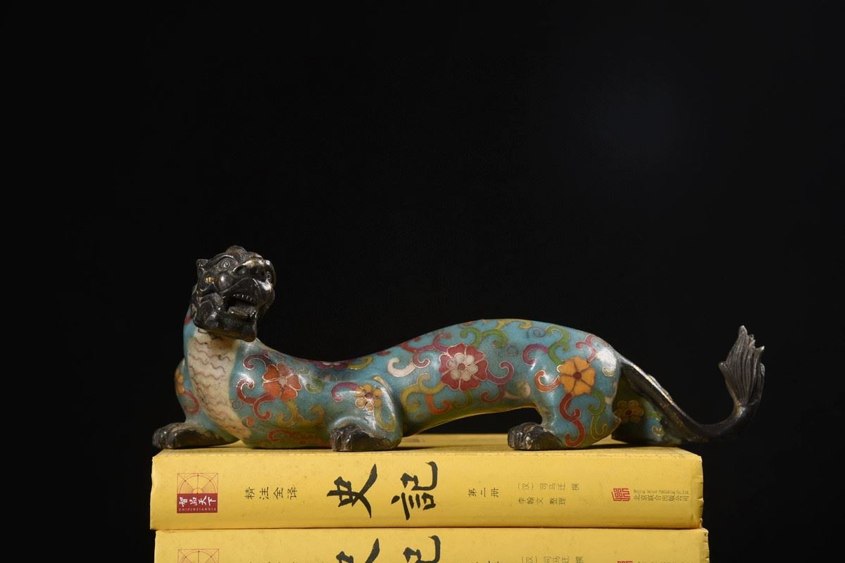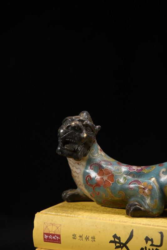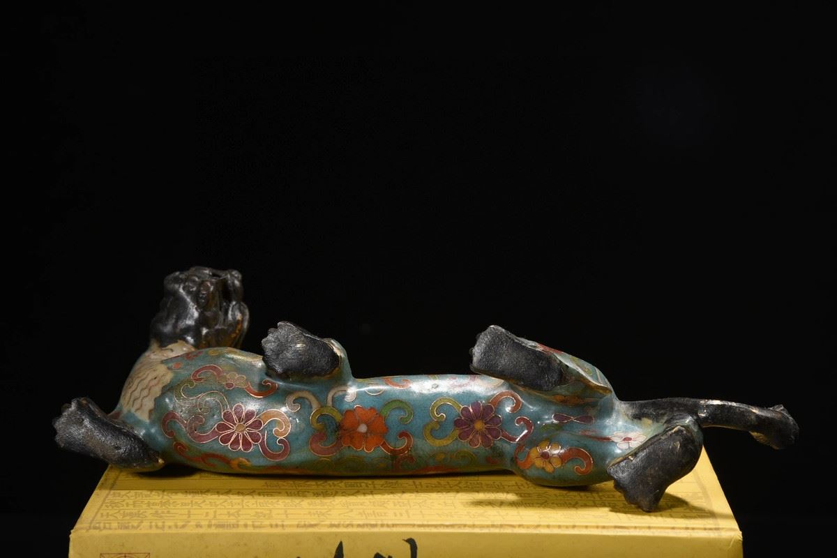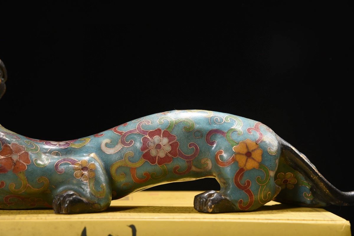 This cloisonné recumbent beast ornament features a strikingly elongated form, with the head raised and turned to the side, exuding both majesty and vitality. The blue ground is richly decorated with entwined floral motifs in brilliant colors, showcasing fine craftsmanship. The beast’s head is cast with great detail, its piercing eyes full of spirit, while the slightly raised tail adds liveliness to the figure. Symbolizing protection, peace, and auspiciousness, this piece is both a decorative treasure and a collectible work of art.