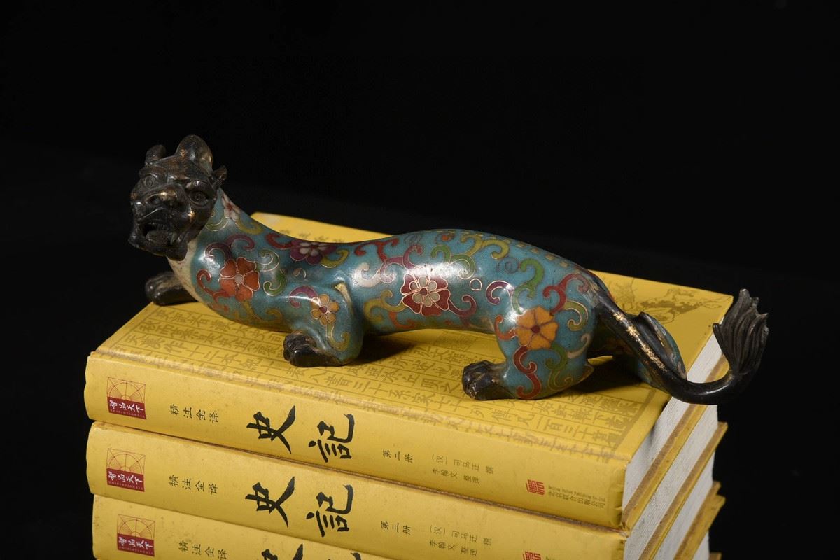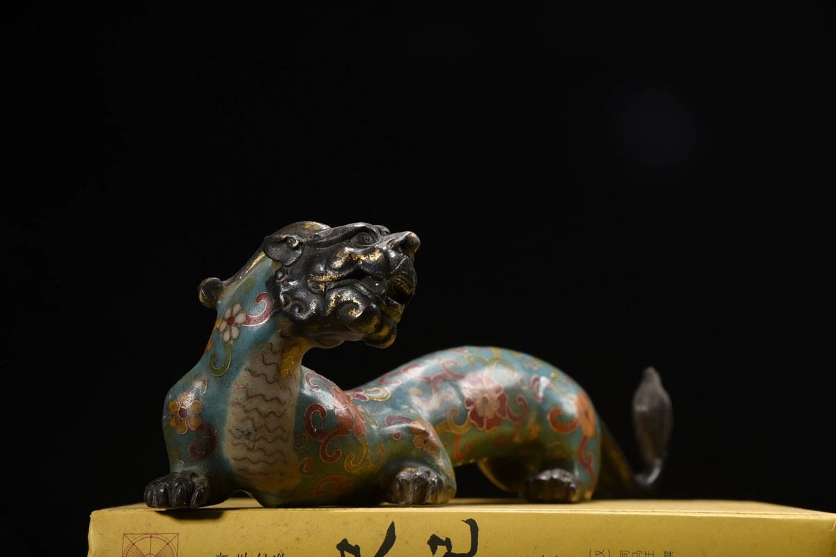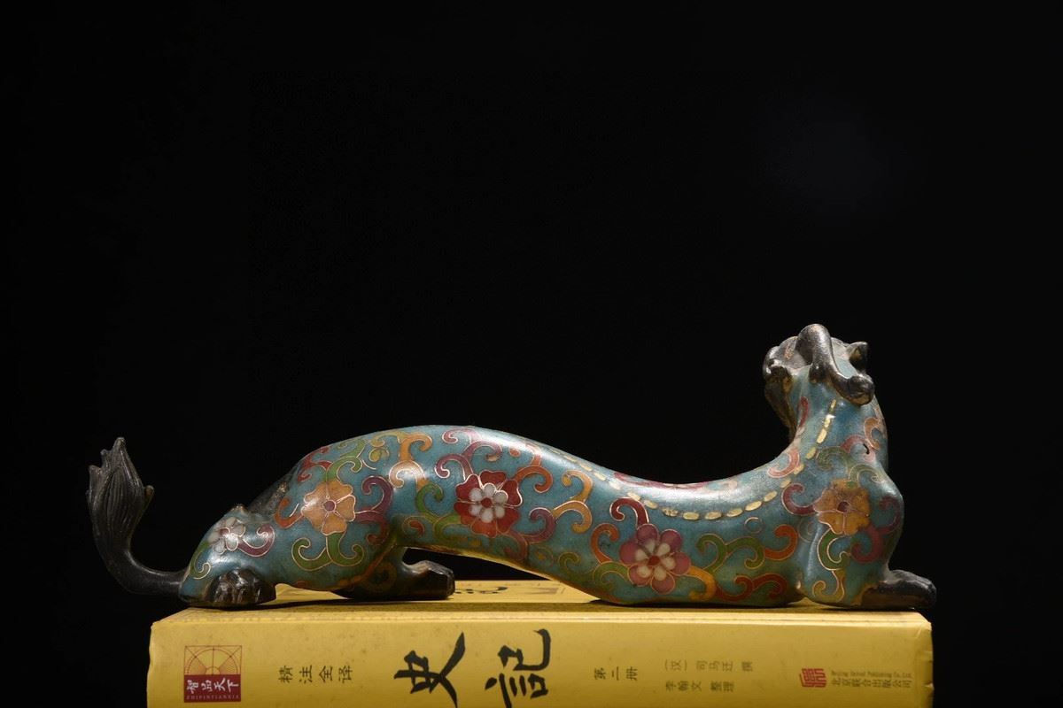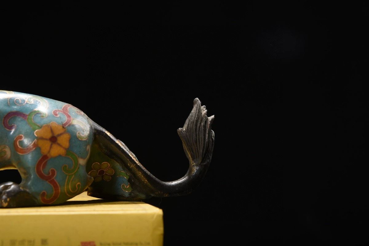 This cloisonné recumbent beast ornament features a strikingly elongated form, with the head raised and turned to the side, exuding both majesty and vitality. The blue ground is richly decorated with entwined floral motifs in brilliant colors, showcasing fine craftsmanship. The beast’s head is cast with great detail, its piercing eyes full of spirit, while the slightly raised tail adds liveliness to the figure. Symbolizing protection, peace, and auspiciousness, this piece is both a decorative treasure and a collectible work of art.