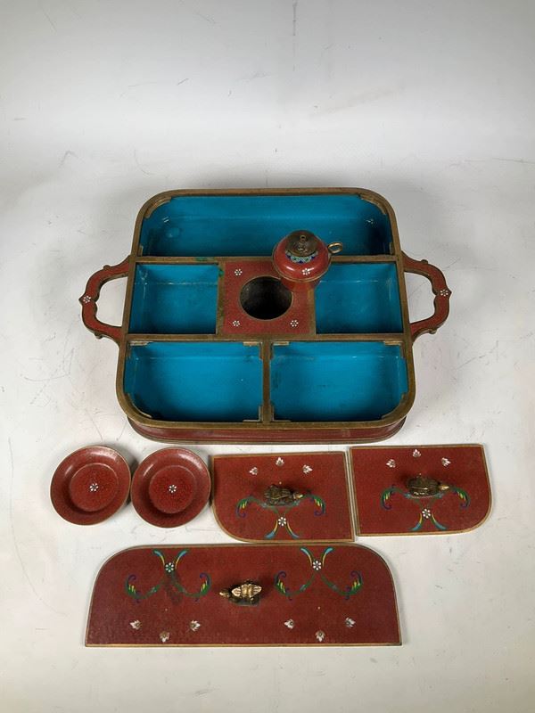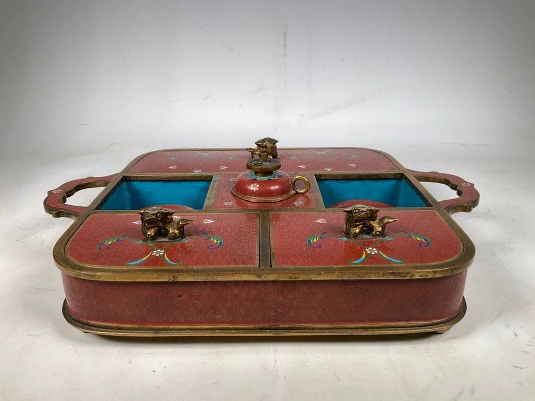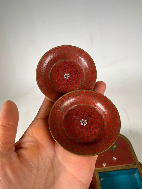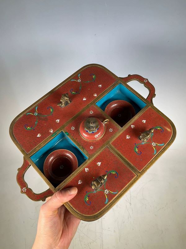 This cloisonné smoking set is designed in a square shape with a delicate red enamel base, decorated with graceful floral and bird patterns, showcasing the beauty of traditional Chinese craftsmanship. At the center, there is a small smoking container, with symmetrical compartments on either side for additional smoking accessories. The ornate metallic beast-head handles on each corner add both decorative and functional value. The interior is lined with soft azure blue glass, enhancing the overall visual harmony of the piece.