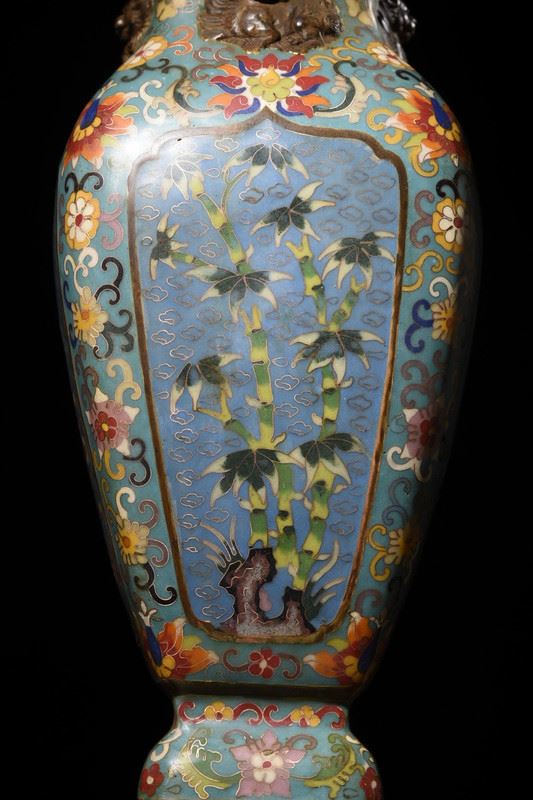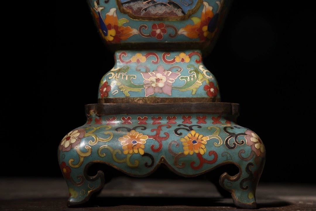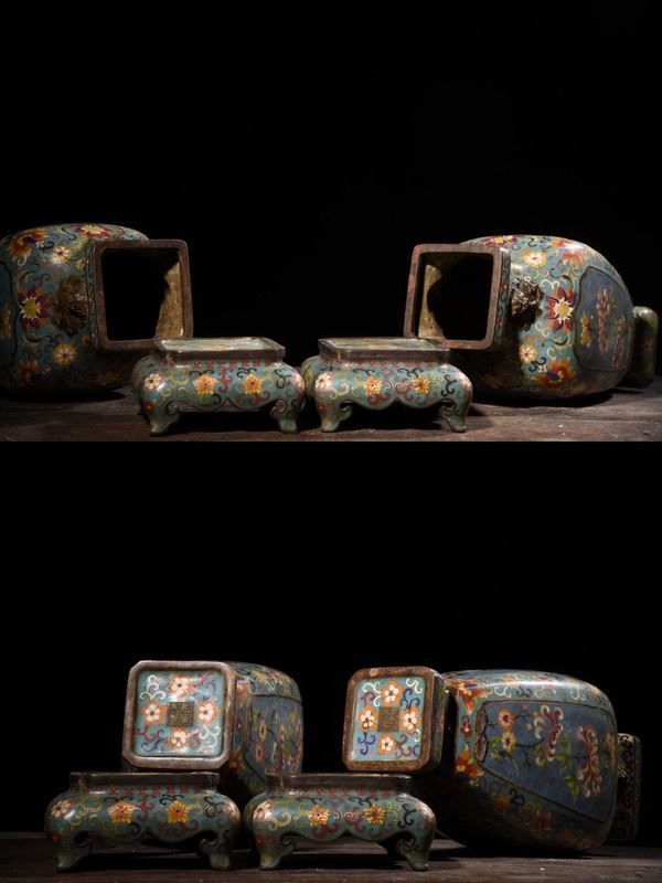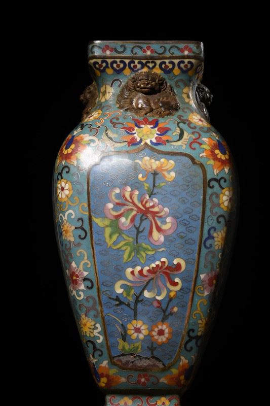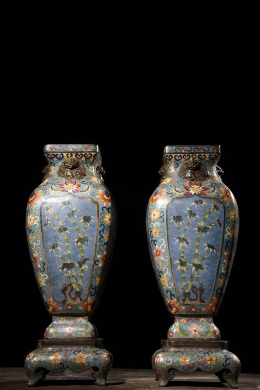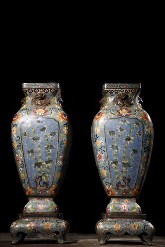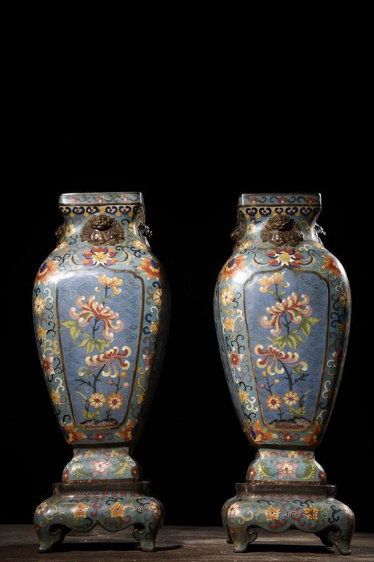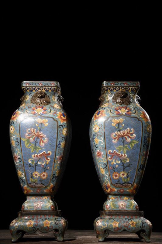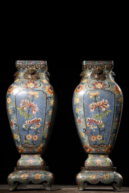 This pair of cloisonné square vases features a blue ground adorned with vibrant floral motifs, displaying both vivid colors and refined layers. The gilt beast-head handles with rings add a sense of majesty and elegance. The form harmonizes square and round elements, symbolizing balance, auspiciousness, and prosperity. With exquisite craftsmanship, these vases embody the unique charm of cloisonné art, making them highly valuable for both display and collection.