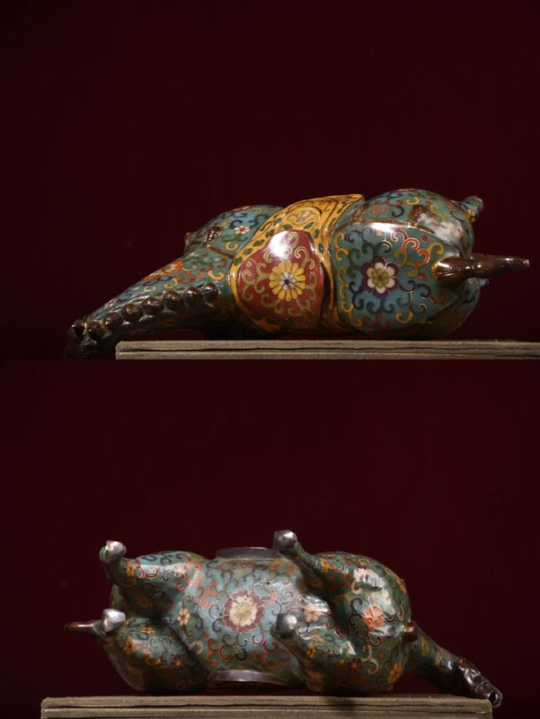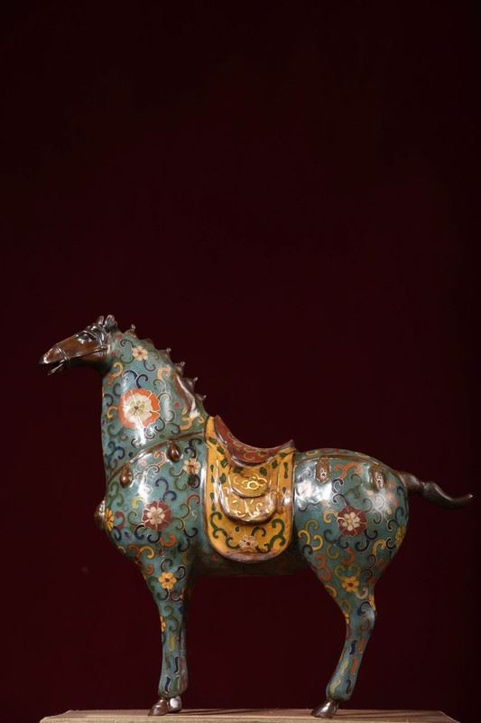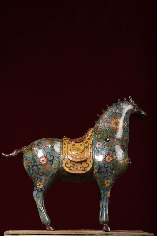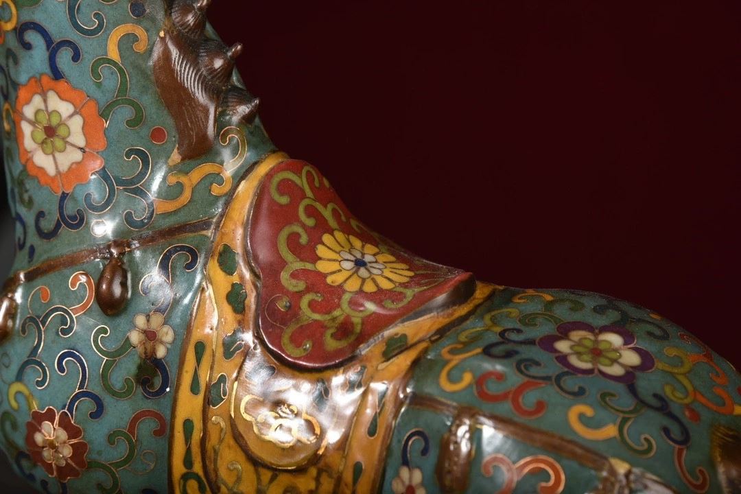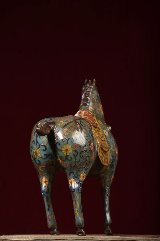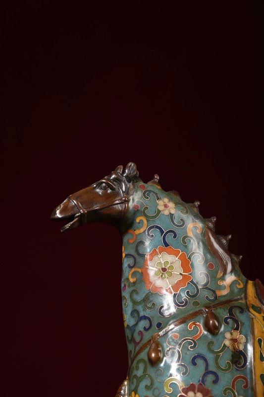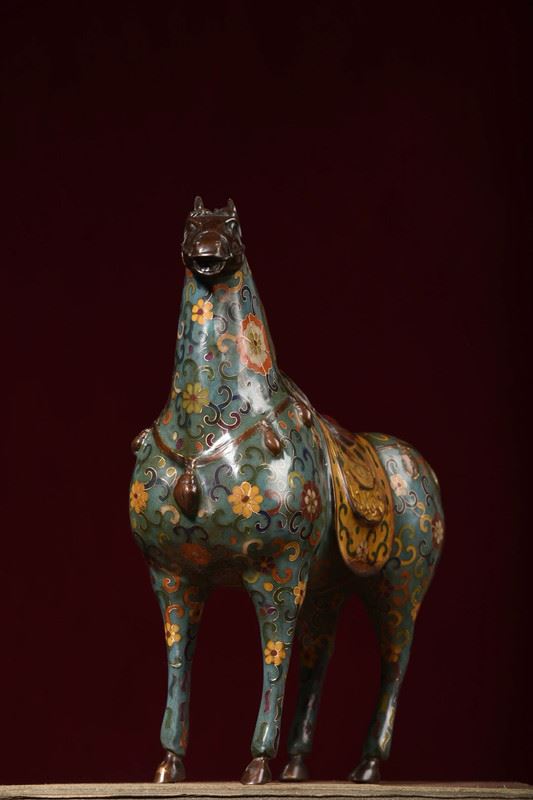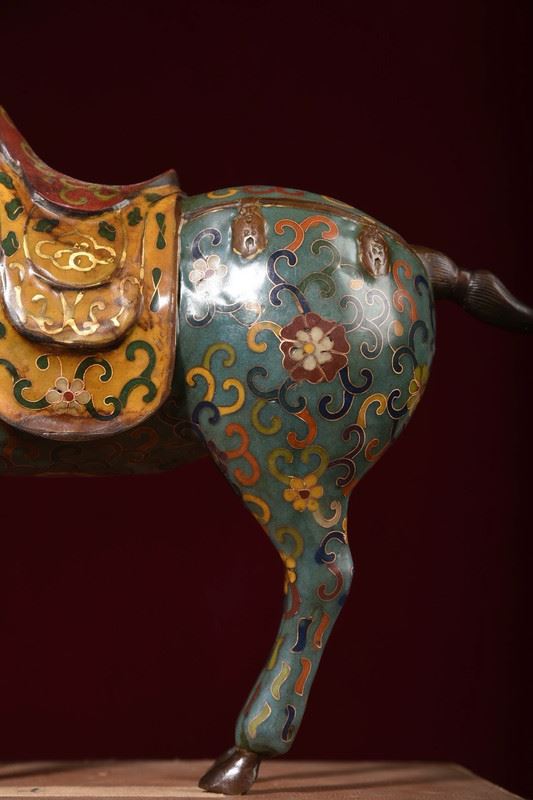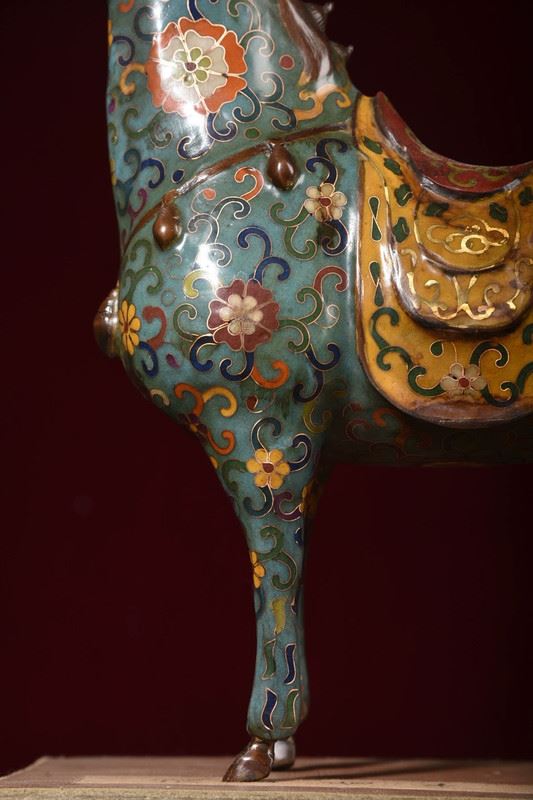 This cloisonné standing horse ornament depicts a majestic steed with head raised high, embodying vigor and nobility. The blue ground is richly adorned with scrolling floral motifs in brilliant colors, while the golden saddle adds an aura of dignity and grandeur. With exquisite craftsmanship and elegant form, it symbolizes auspiciousness and progress, making it a fine piece of art for both display and collection.