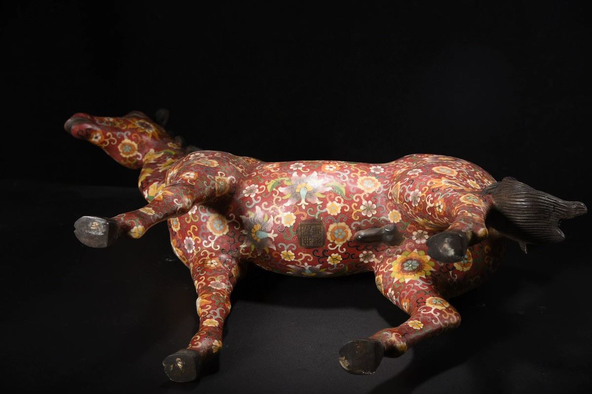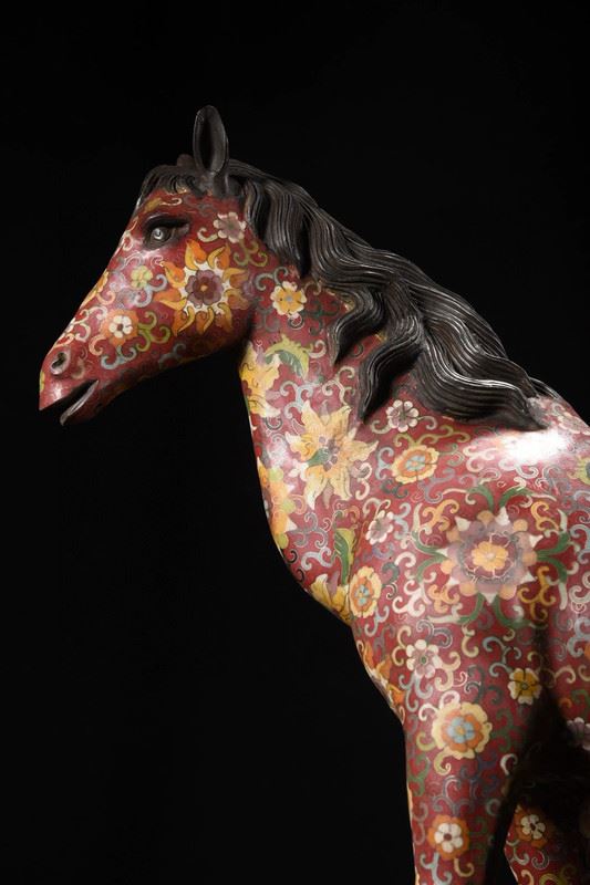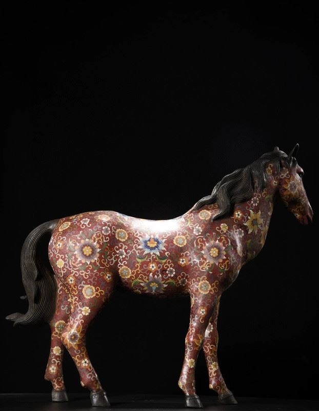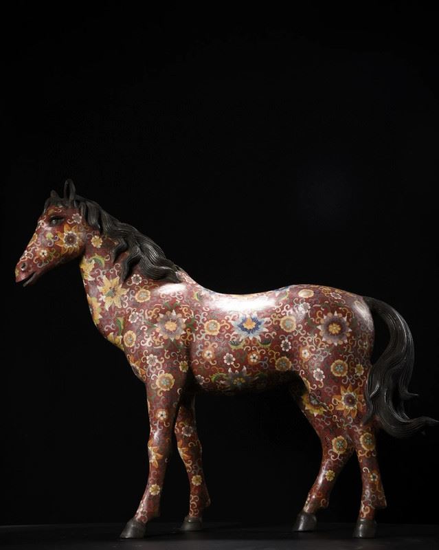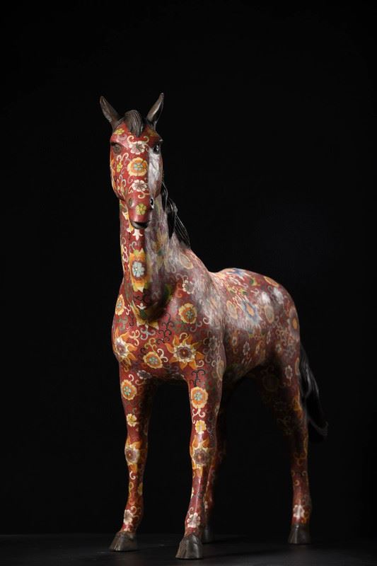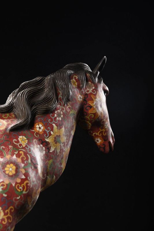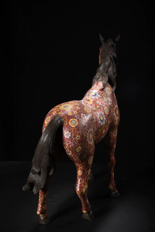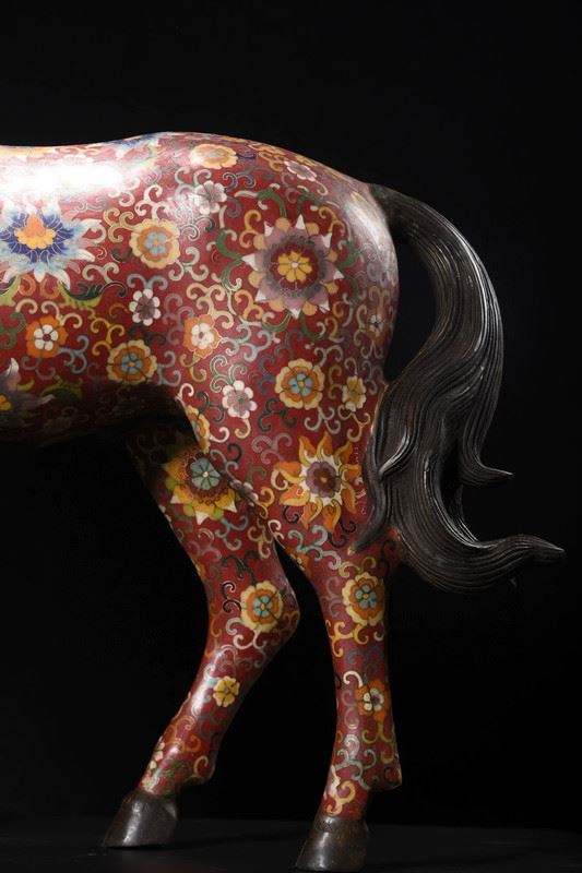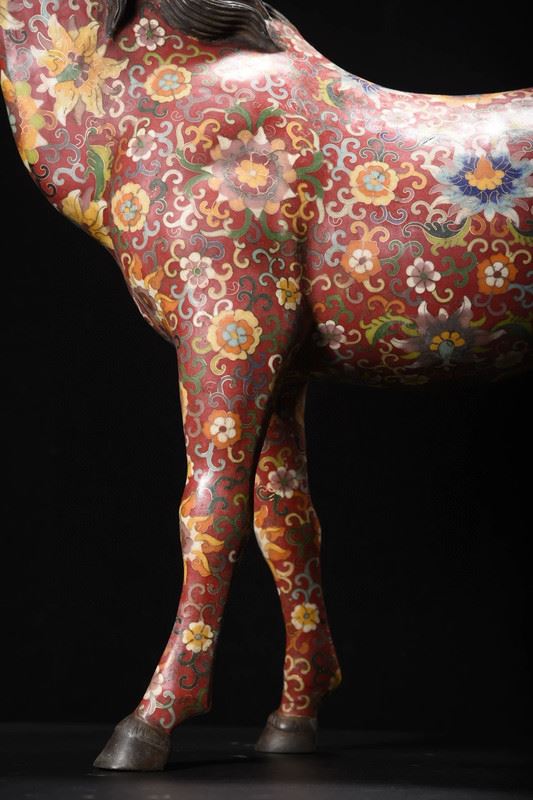This cloisonné standing horse ornament is crafted with lifelike form, standing firmly with a dignified stance. The red ground is richly decorated with intricate scrolling floral motifs, exuding brilliance and elegance. The mane and tail are cast in bronze with flowing lines, adding vitality and natural grace. With exquisite craftsmanship, the piece captures the strength and spirit of the horse, symbolizing prosperity, auspiciousness, and progress. Both decorative and collectible, it represents a refined example of cloisonné artistry.
