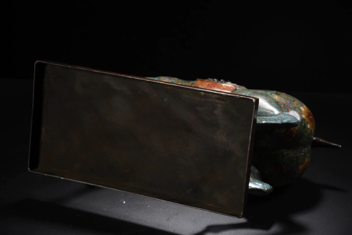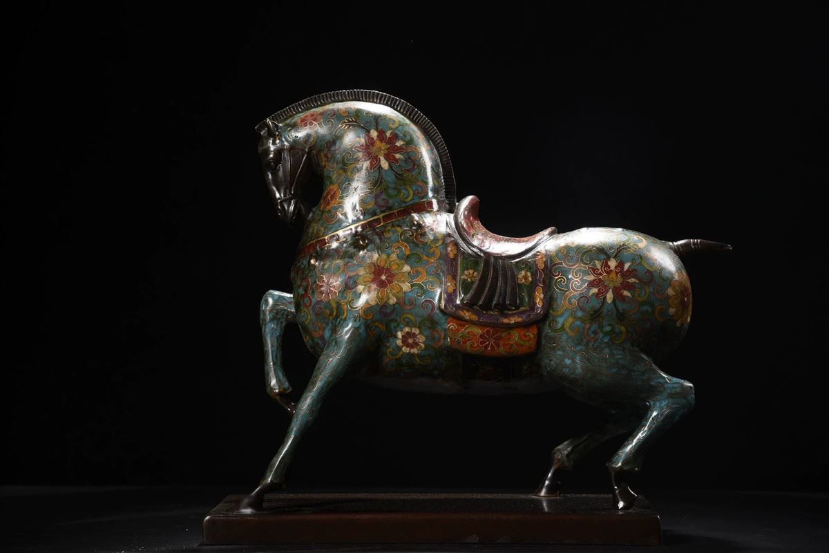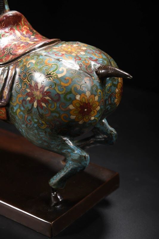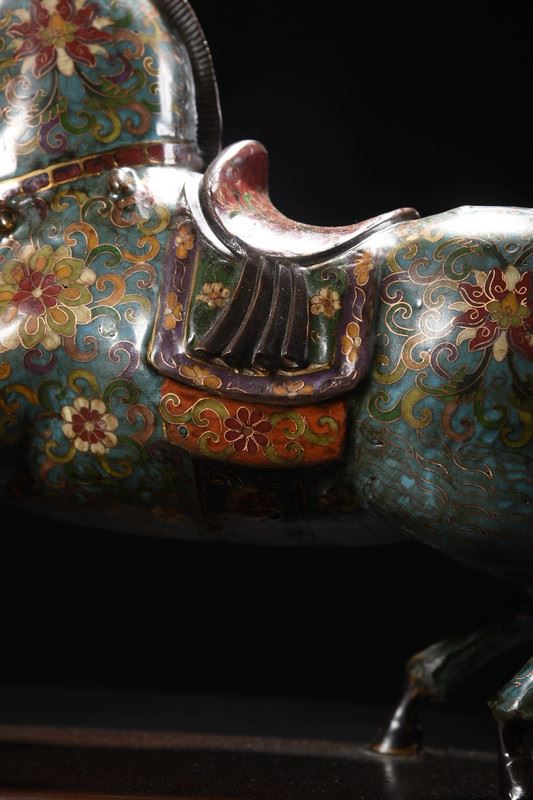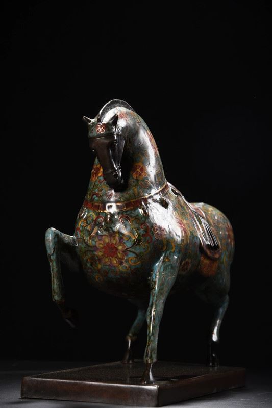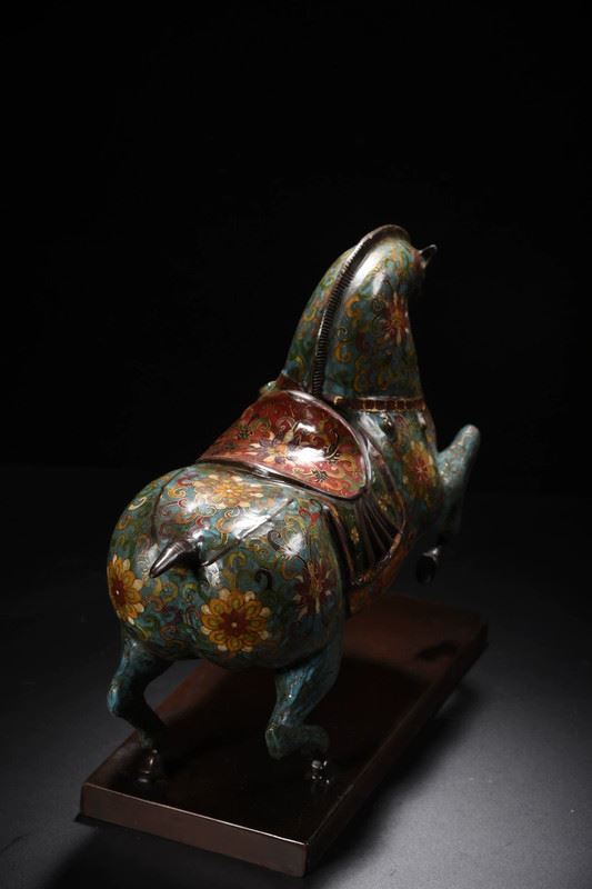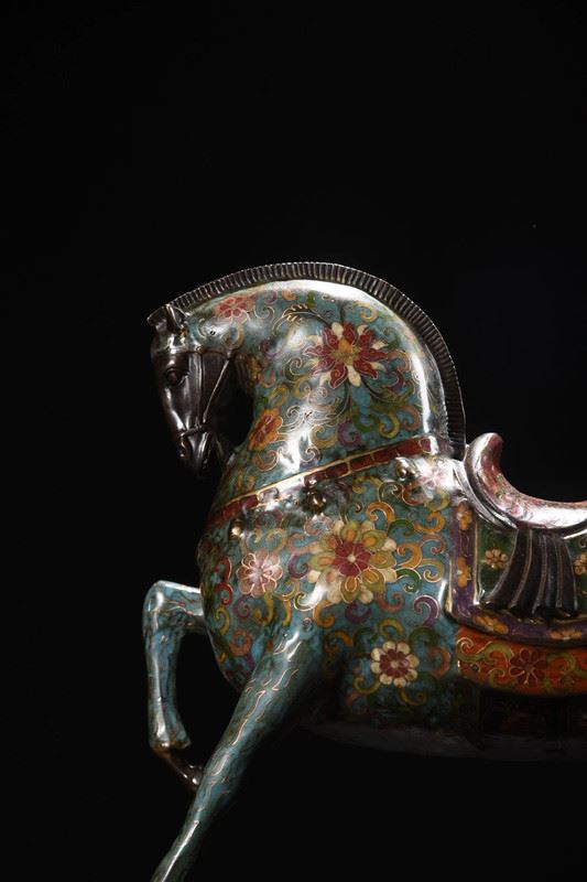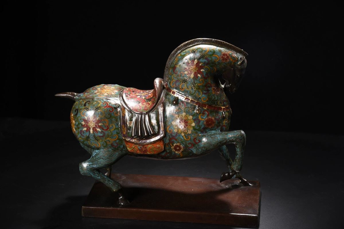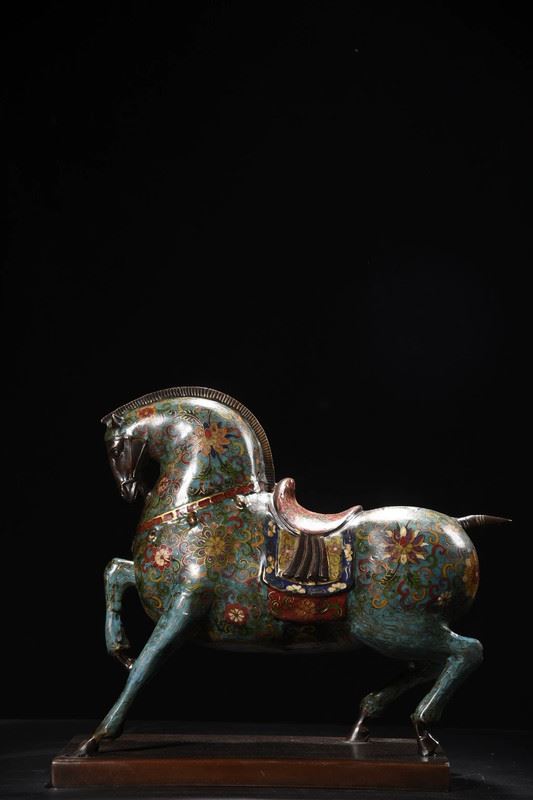 This cloisonné steed ornament captures the majestic posture of a horse with its head held high and one leg raised, exuding vigor and strength. The body is richly decorated with intricate floral motifs in vibrant yet refined colors, showcasing the sophistication and brilliance of cloisonné craftsmanship. The saddle’s simple elegance complements the ornate design, symbolizing both prosperity and progress. It stands as a fine piece of art, equally valuable for display and collection.