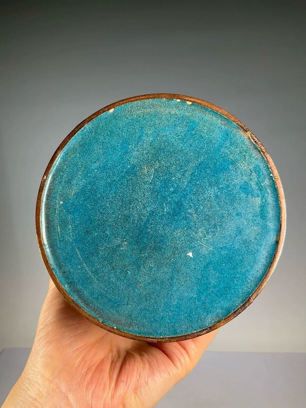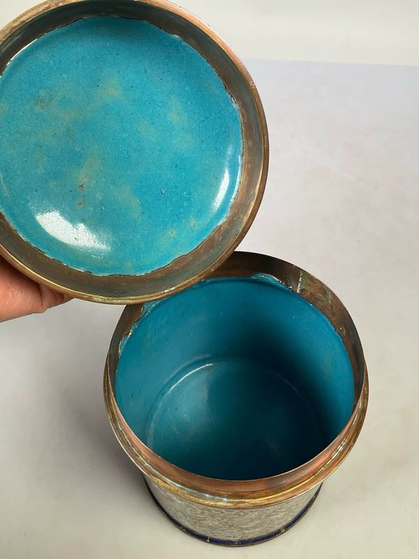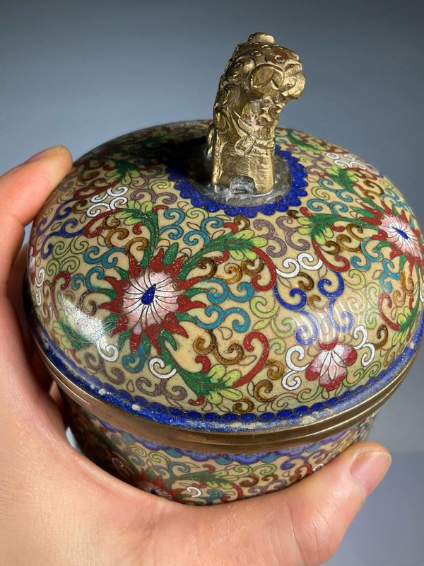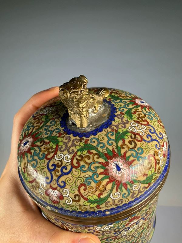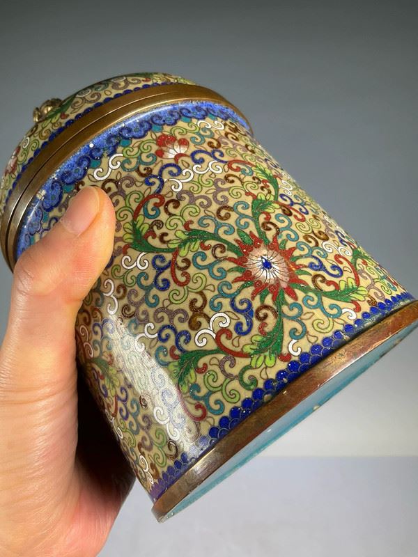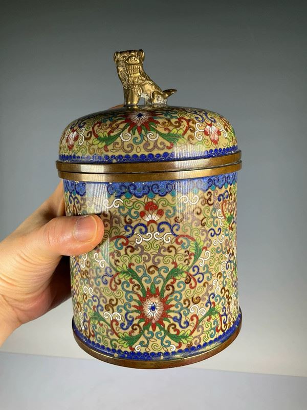 This tea caddy is crafted in cloisonné enamel on a copper body, of cylindrical form with straight sides and a domed cover. The body is decorated with scrolling lotus patterns in vibrant enamels against a beige ground. The cover is surmounted by a gilt bronze foo dog finial, symbolizing protection and auspiciousness. Both functional and decorative, this cloisonné tea caddy reflects the refined artistry of traditional Chinese enamelwork.