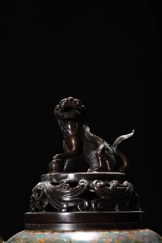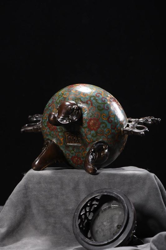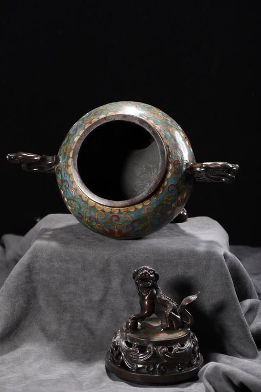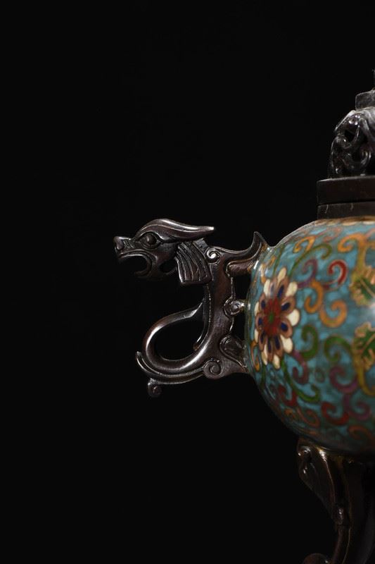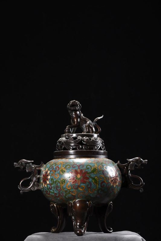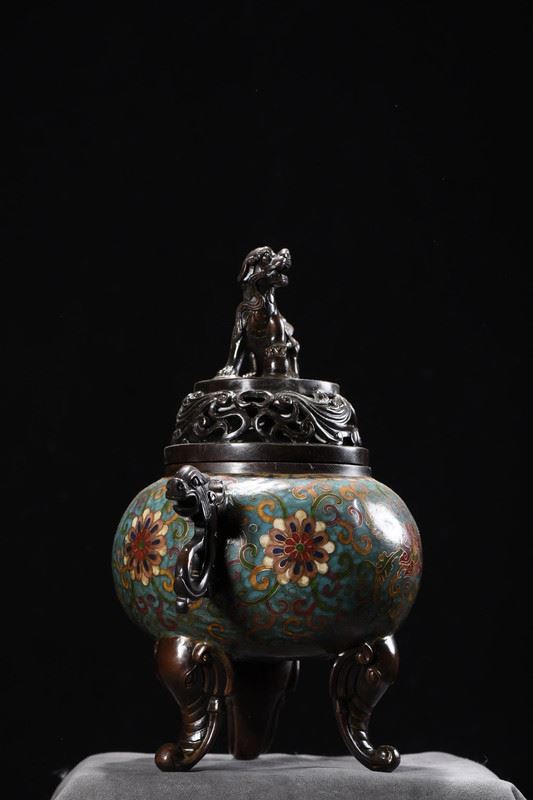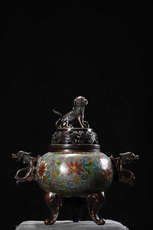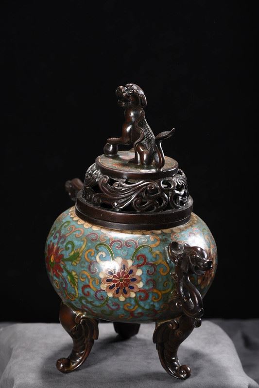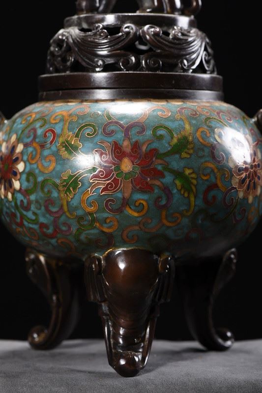 This cloisonné tripod censer features a blue ground decorated with intricate lotus scrolls and blooming floral motifs in vivid, splendid colors. The side handles are formed as dragon heads, embodying strength and auspicious protection. The three sturdy legs provide stability and grandeur to the vessel. The pierced cover is surmounted by a finely cast lion finial, majestic and powerful, symbolizing authority and good fortune. Exquisitely crafted and imposing in presence, this censer is both a functional ritual object and a masterpiece of artistic collection.