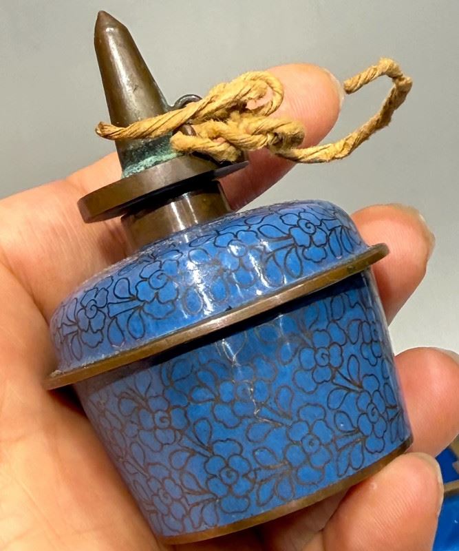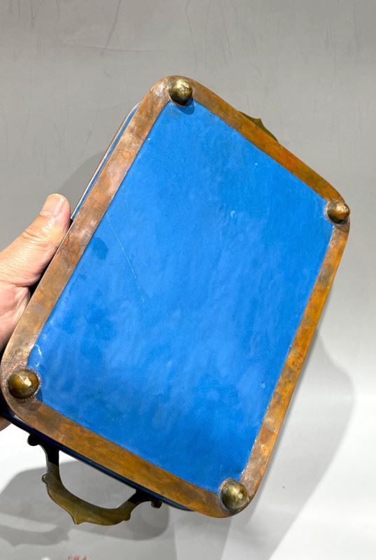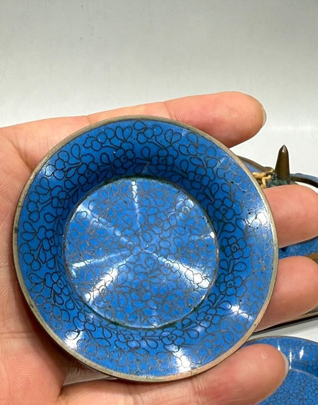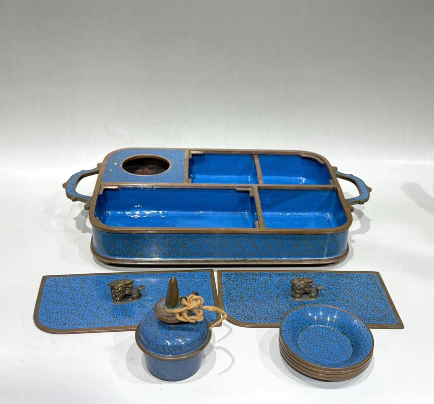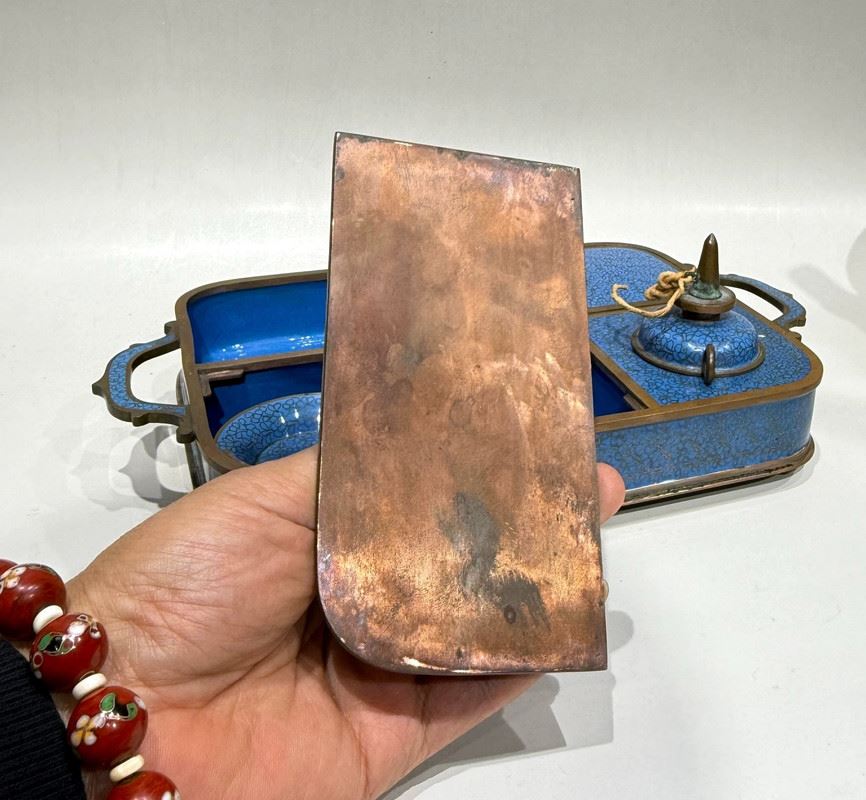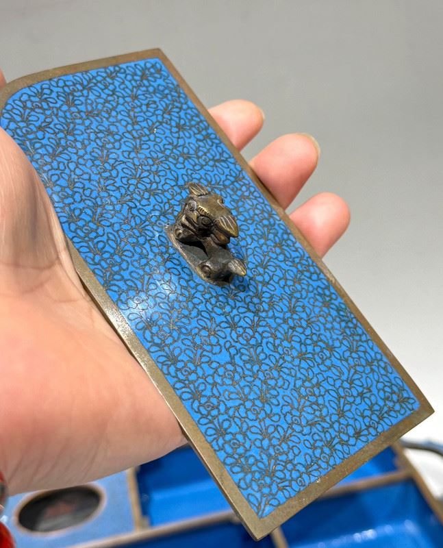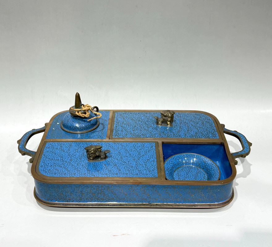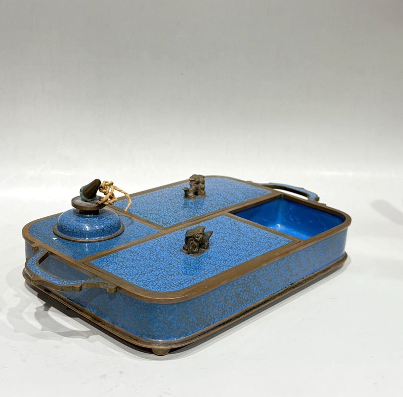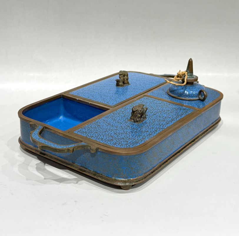 This cloisonné smoking tray is crafted on a copper base with a turquoise-blue enamel ground, beautifully adorned with scattered floral motifs in vibrant colors. The compartmentalized design enhances its practicality while the finial knobs, shaped as auspicious animals, add a touch of antiquity. Meticulously made, it embodies the distinctive elegance of cloisonné artistry while serving as a refined scholar’s object, making it both functional and collectible.