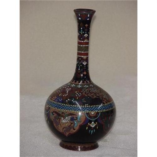 A Japanese Cloisonné vase, 7 1/2" tall, 3 3/4" diameter. Floral and geometric designs combine with dragon and Pheonix bird themes. Condition is very good with no damage. A beautiful cabinet piece.
