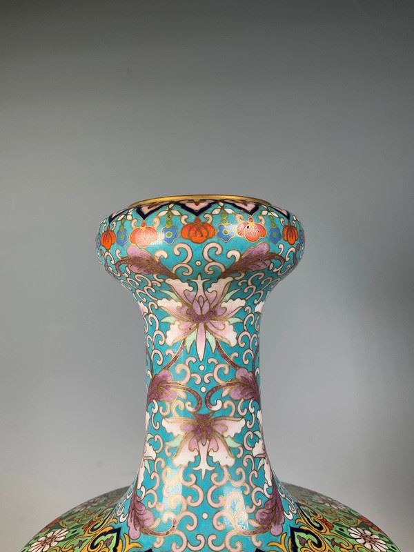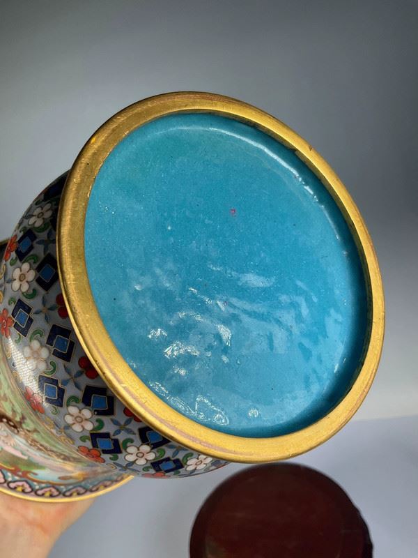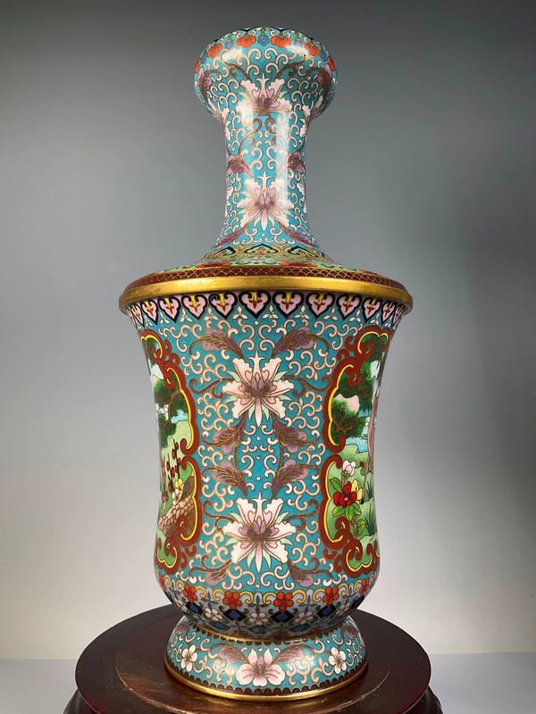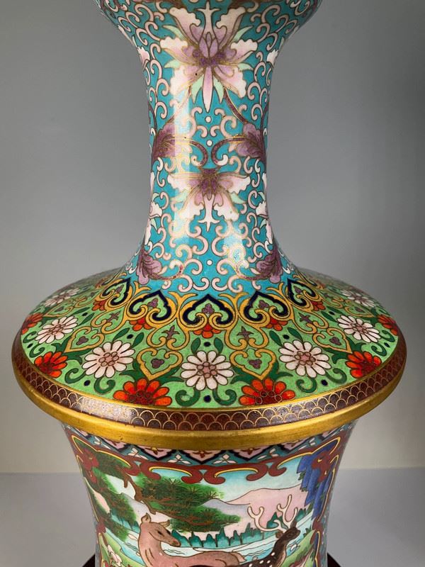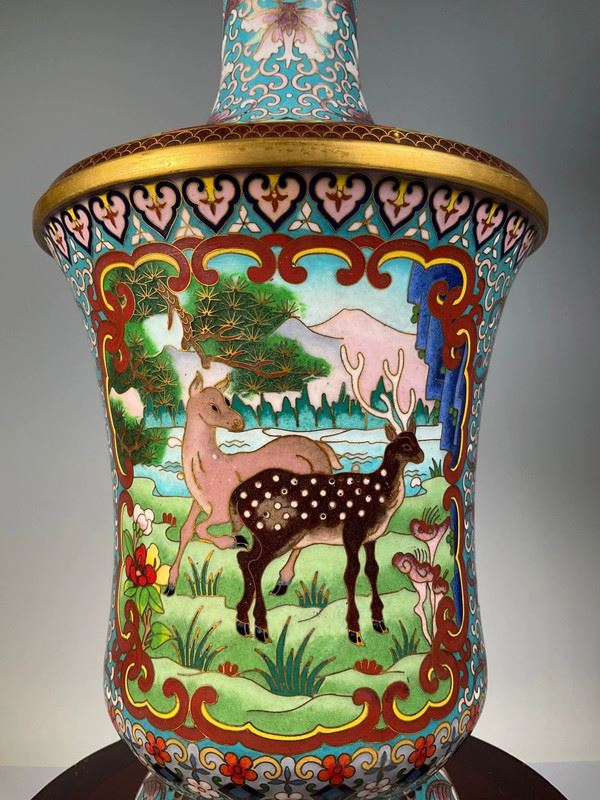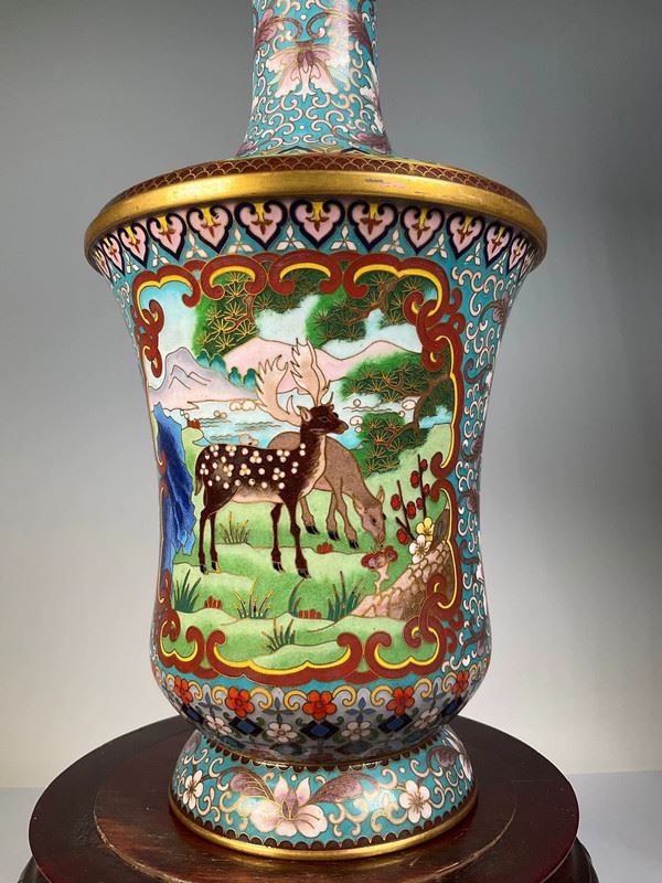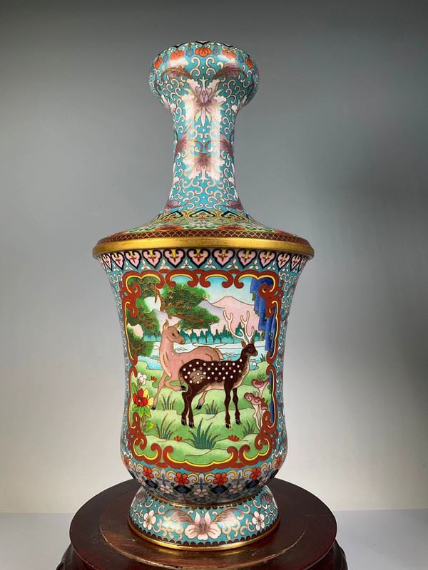 This exquisite cloisonné vase features a vivid depiction of deer in a serene natural setting, showcasing a harmonious scene of nature. Crafted with traditional cloisonné techniques, the vibrant colors and intricate details make this artwork exceptionally unique. The deer, symbolizing good fortune and longevity, adds a layer of cultural significance. This piece is not only a work of art but also a valuable collectible, demonstrating the mastery of Chinese traditional craftsmanship and aesthetics.