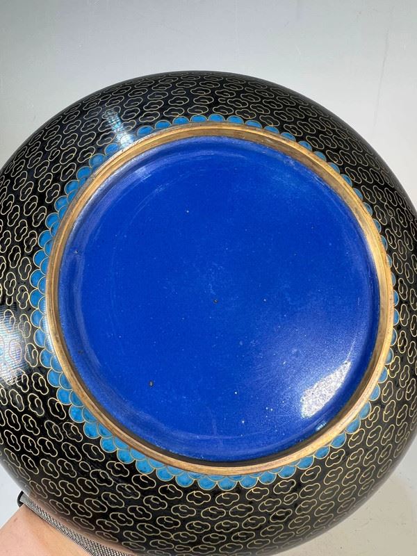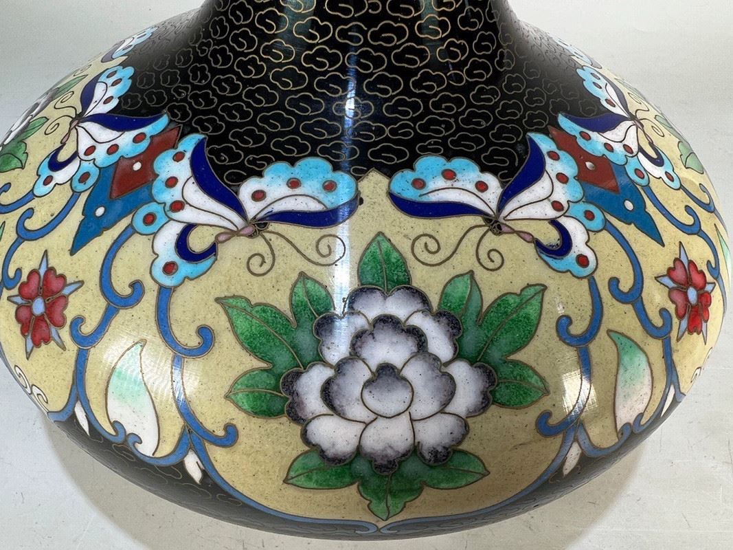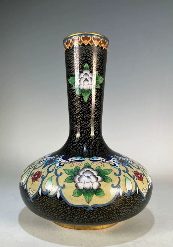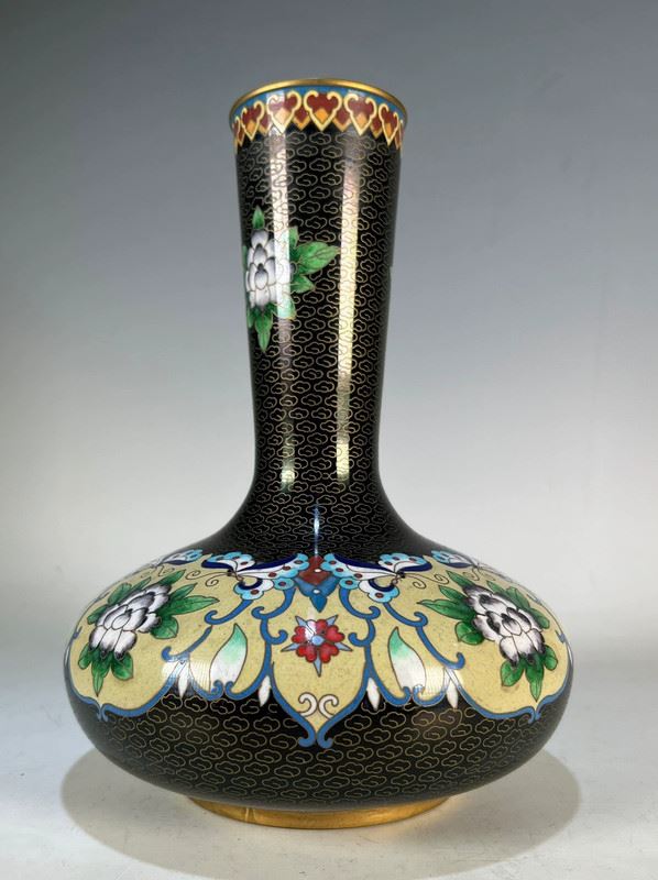 This exquisite cloisonné vase features a striking floral motif with intricate detailing. The body of the vase is adorned with elegant flowers in soft white and vibrant green, framed by delicate blue and red accents. The black enamel background adds a sense of sophistication, while the gold rim at the top enhances the overall elegance of the piece. The traditional craftsmanship of cloisonné is evident in the smooth and precise patterns, making this vase a true work of art.
