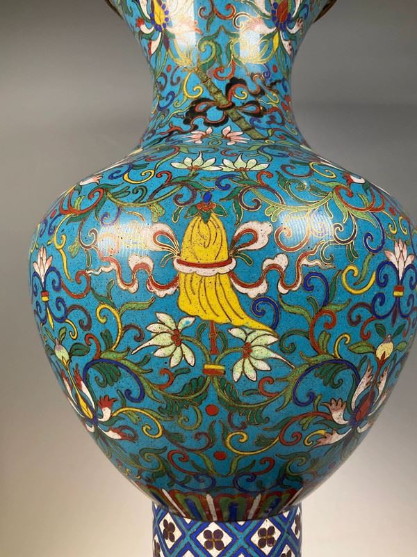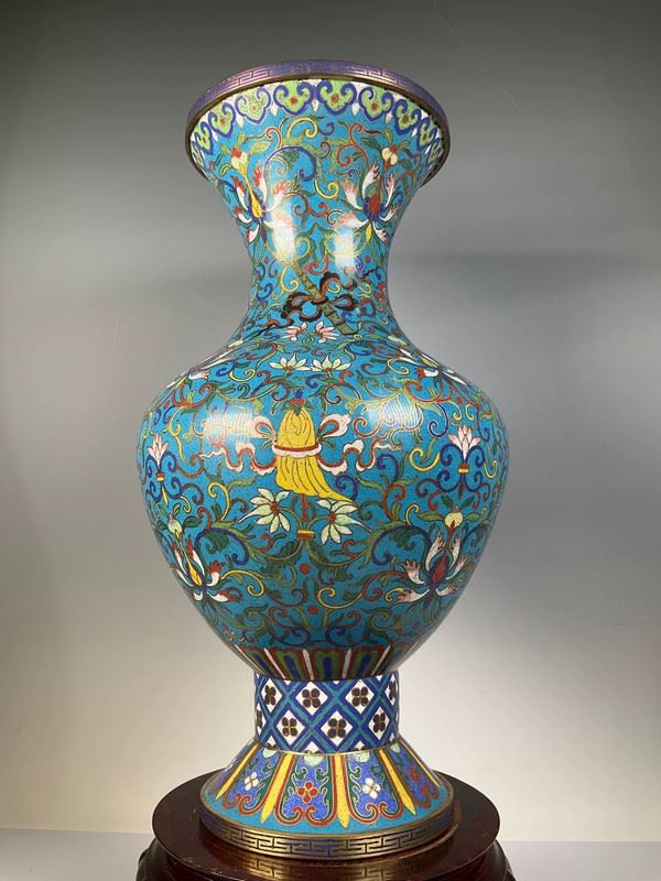 This large cloisonné vase is crafted with a copper body and decorated using the cloisonné enamel technique. The bright turquoise ground is adorned with intricate floral and auspicious motifs. With its elegant, full form and vibrant colors, the vase symbolizes prosperity and good fortune. It serves not only as a decorative piece but also as a collectible artwork, showcasing the mastery and artistic charm of traditional craftsmanship.