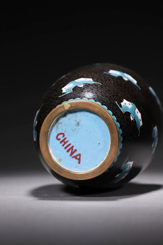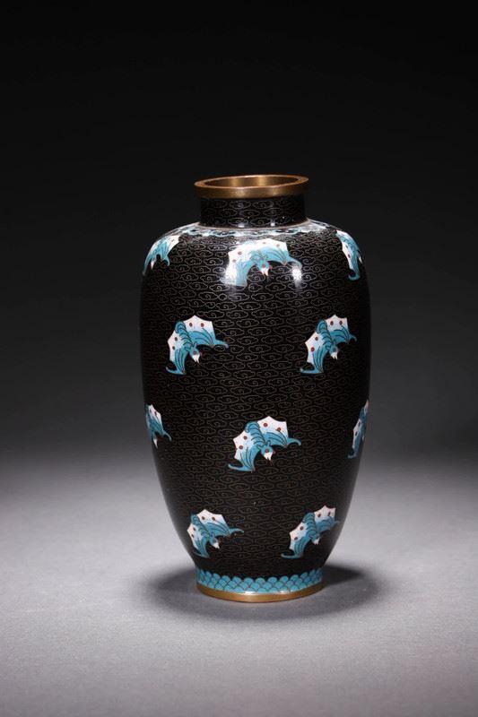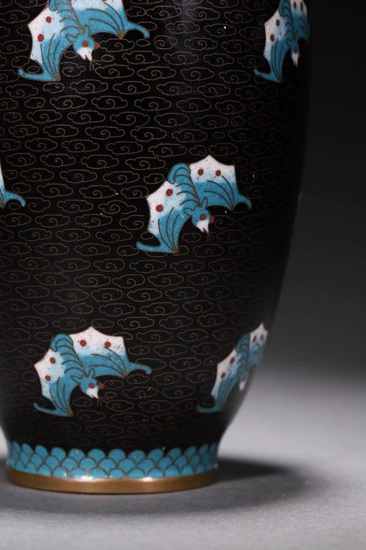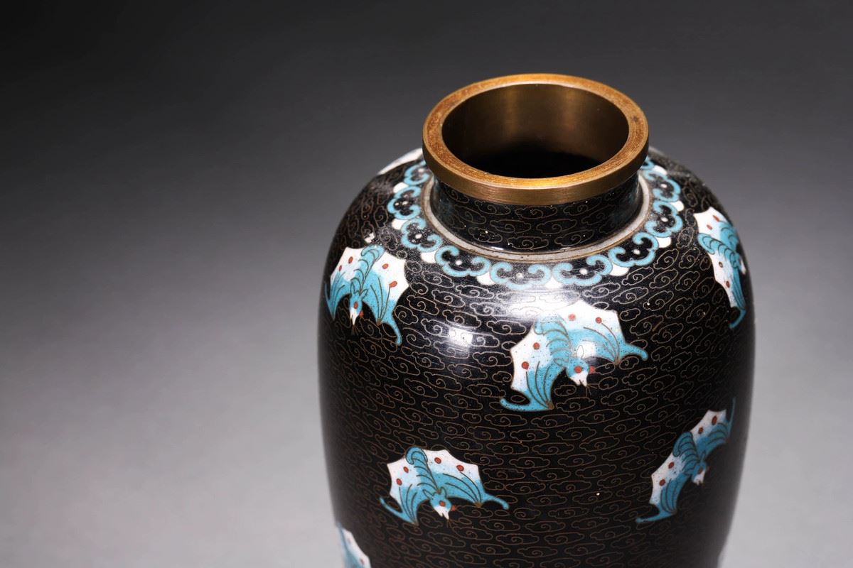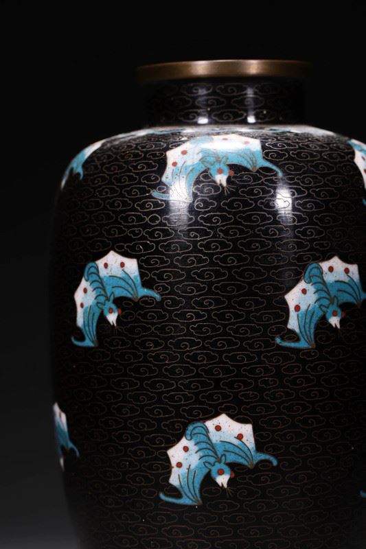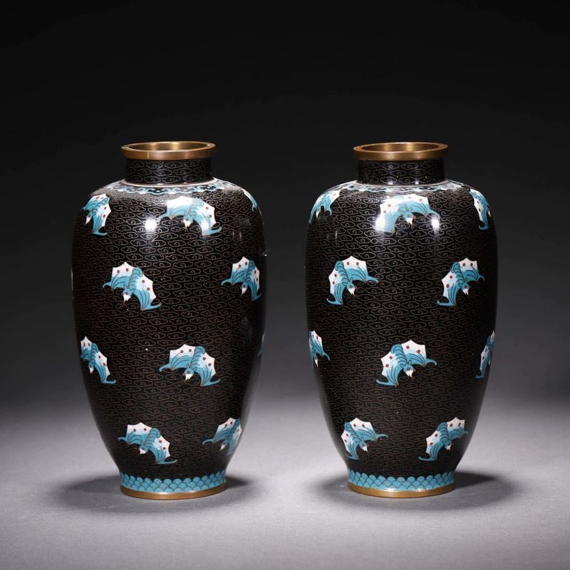 This pair of cloisonné vases exemplifies fine craftsmanship and elegant form, featuring a black enamel background that highlights the vivid blue bat motifs. In Chinese culture, bats symbolize good fortune, and together with the word "vase" (ping, 平), they convey the auspicious wish for "happiness and peace." The evenly distributed bat designs create a harmonious balance between solemnity and liveliness. The gilt bronze rims and bases add to the overall splendor. These vases are not only exquisite decorative pieces but also valuable cloisonné artworks with rich cultural symbolism.