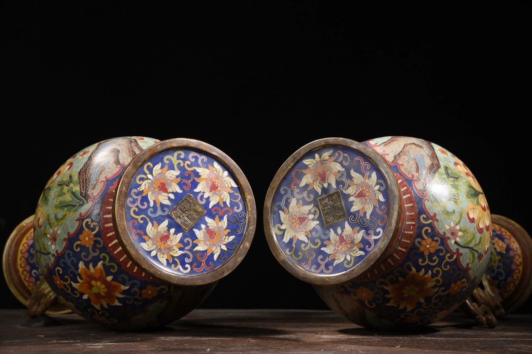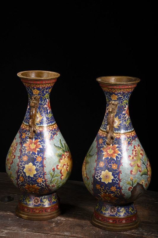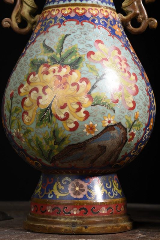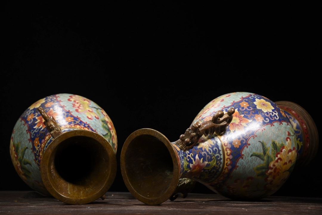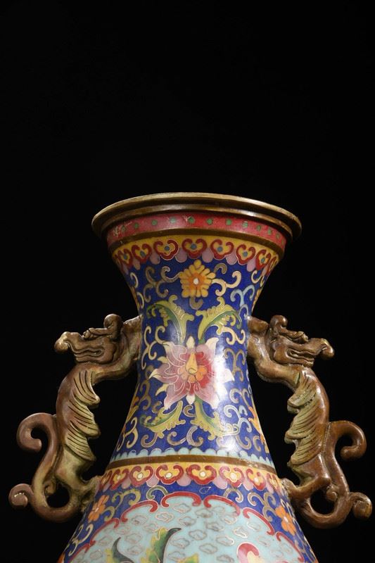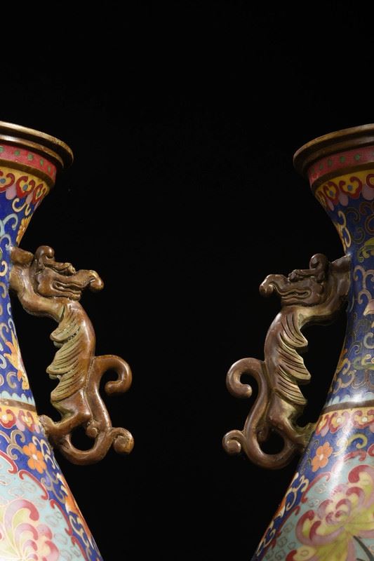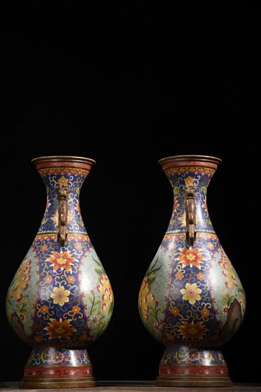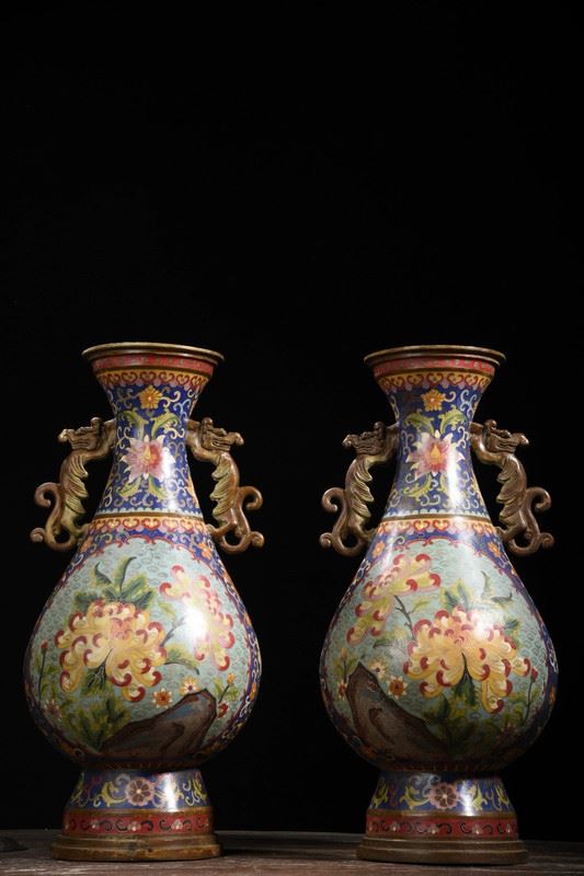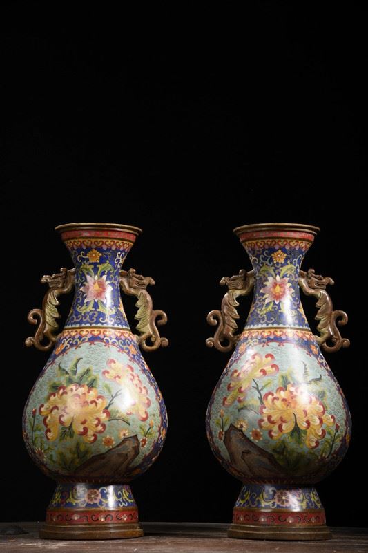 This pair of cloisonné vases features vibrant floral motifs set against a rich blue background, bringing out the elegance and vitality of blooming flowers. The dragon-shaped handles on each side symbolize power and auspiciousness, while the graceful form enhances their grandeur. They embody the exquisite craftsmanship of cloisonné and reflect the charm of traditional Eastern aesthetics, making them both decorative treasures and valuable collectibles.