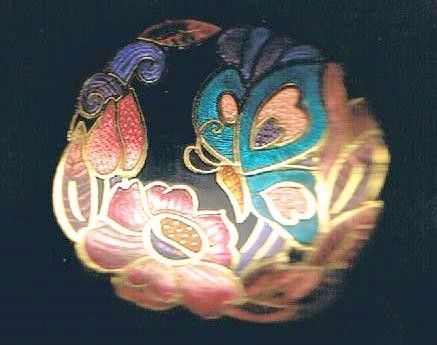 Approximately 2" in size. The butterfly is a turquoise and pink color. The flower(s) and leaves are shades or pink. Very pretty. Gold tone metal with scalloped edges.