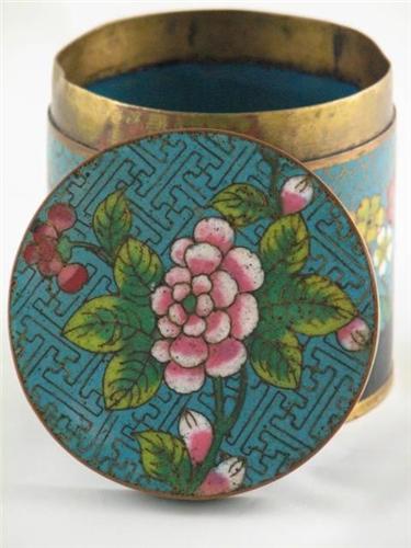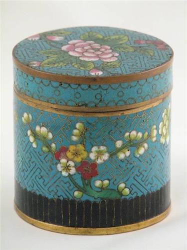 An Old Cloisonne Brass Round box with turquoise background and floral foliage design. Unmarked, Condition: sompinpoints and some enamel missing on edge of rim, brass on rimof base bent. Dimensions: 3.125"H x 3"D.