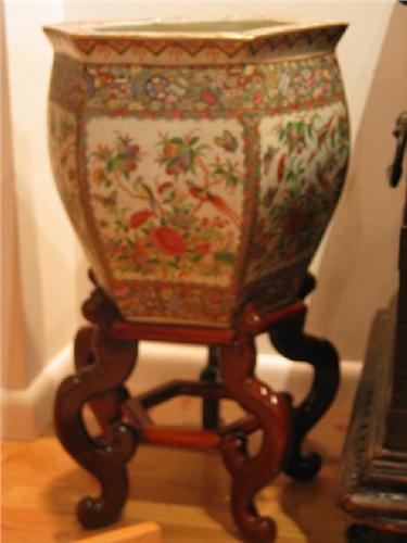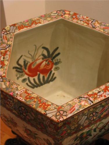 Northern China (20th century) with interior carp motif and 12" teakwood stand, 15" by 16"