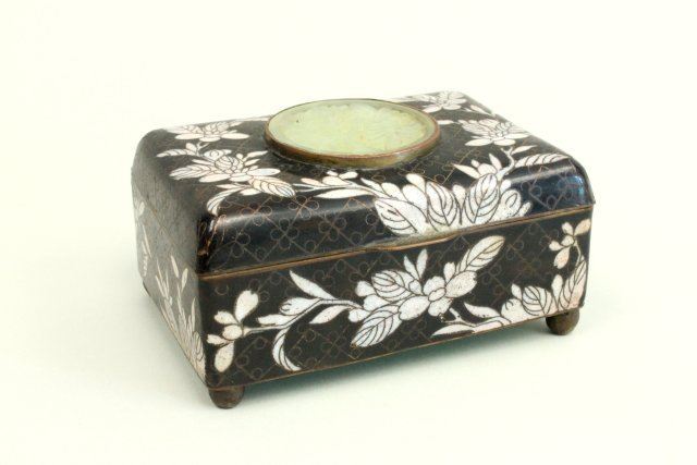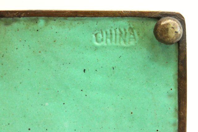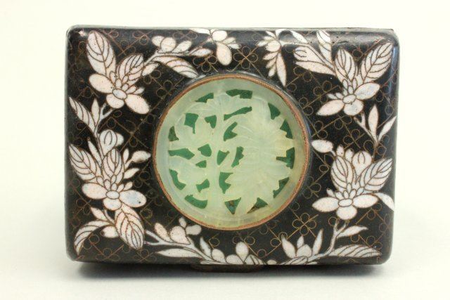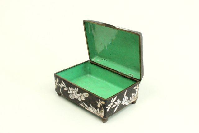 "Floral" design, stamped China. Approx. 2" x 3" x 4". Minor enamel loss to interior.