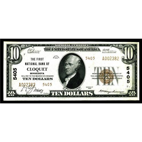 <B>Cloquet, MN</B></I> - $10 1929 Ty. 2 <B>The First NB</B></I> Ch. # 5405<BR>A bright <B>About Uncirculated</B></I> note with all the eye appeal of a higher grade. While certainly not from a bank that could be characterized as scarce, the overall attractive condition of this $10 type 2 should carry it to no less than...