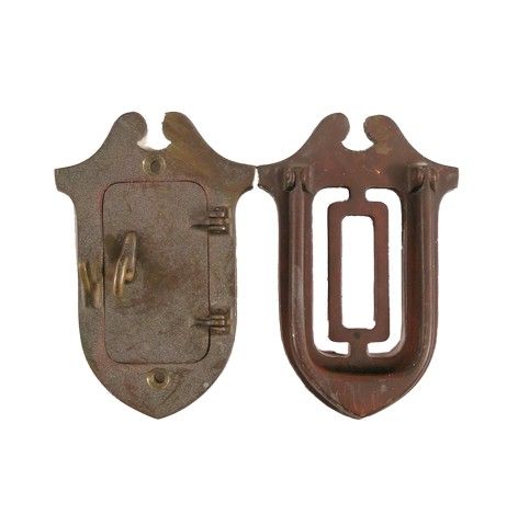Close Encounters Door Peep Hole Frame/Knocker Prop - Considered perhaps the greatest alien sci-fi motion picture even made, Steven Spielberg was so passionate about his "Close Encounters of the Third Kind", that he continued to fiddle with it for years after its release in 1977, releasing both extended versions, reshooting sequences, adding sequences, and even redoing special effects years after production for even newer releases. This is a metal door knocker and door peep-hole frame from one of the sets in the production.