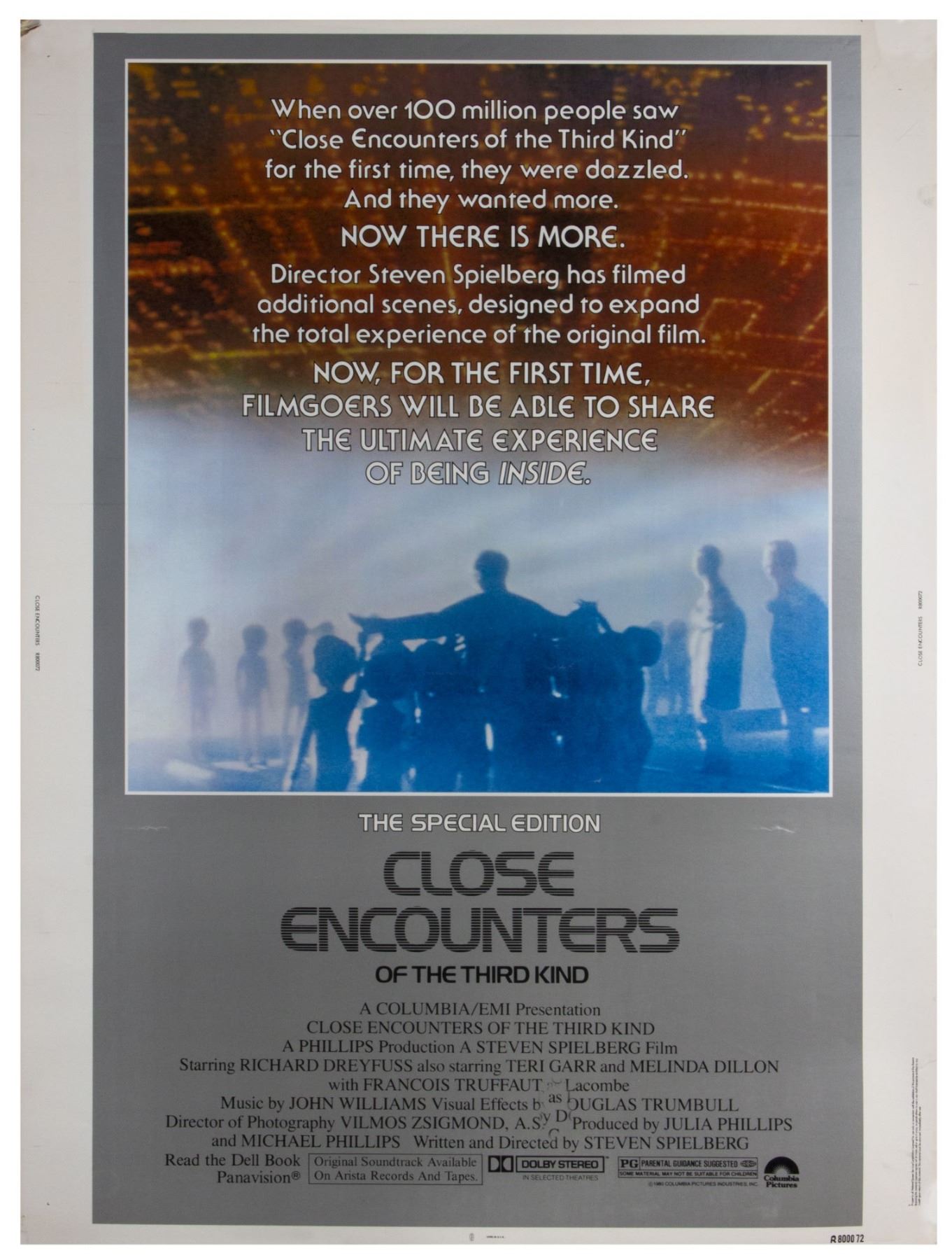 (Columbia, 1980) A rare 40"x30" movie poster for theatrical re-release of "Close Encounters of the Third Kind". The poster was lithographically printed by the National Screen Service on sturdy cardstock for the "Special Edition" re-release of the film. The condition is fair to good, with some creases and wear throughout, particularly to the edge which has some tears in the white margins in the top-left corner.