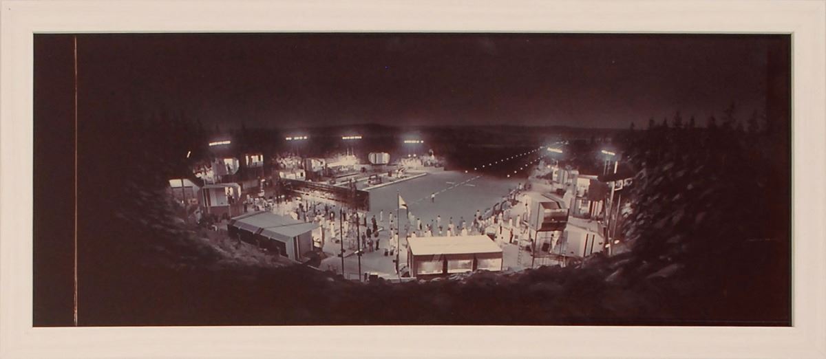 Production-used glossy photo effects 70mm frame blow-up storyboard from the 1977 sci-fi movie Close Encounters of the Third Kind, 19.5 x 7.5, showing the UFO landing. Nicely framed and in fine condition. This was likely used by visual effects supervisor Douglas Trumbull to check the quality of visual effects on film.