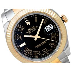 41mm Gents Rolex 18k Gold & Stainless Steel Oyster Perpetual Datejust II Watch. Black Roman Numeral Dial. 18k Yellow Gold Fluted Bezel. 18k Gold...