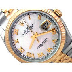 36mm Gents Rolex 18k Gold & Stainless Steel Oyster Perpetual Datejust Watch. Mother Of Pearl Roman Numeral Dial. 18k Yellow Gold Fluted Bezel. 1...