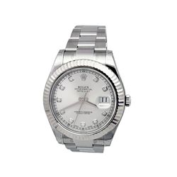 41MM Gents Rolex Stainless Steel Oyster Perpetual Datejust II. Silver 10 round diamond dial. 18k White Gold Fluted Bezel. Stainless Steel Oyster band.
