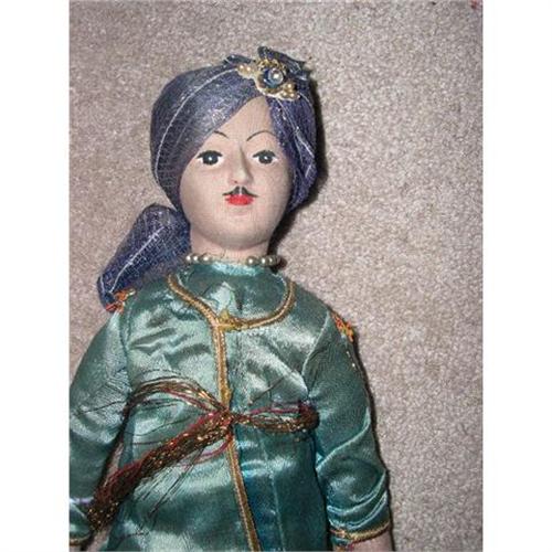 India Prince handmade with molded face. He has some fade to his outfit and the white pants are not as white as they once were. The fancy sash of threads is all split. His face and head look great. The hair was made by using a piece of black cloth. There is a brown stain on the bottom of one foot. If you can enjoy him, please bid. He is from a smoke free environment. Buyer to pay $10.00 for U.S. shipping, insurance, and handling. Thanks for viewing.