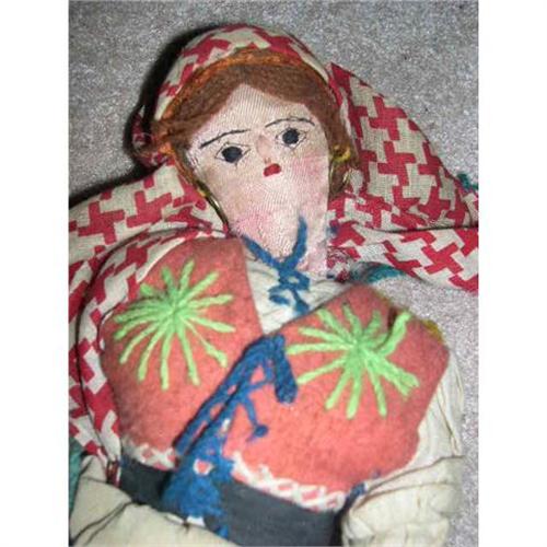 I believe this doll is from the 1930's. She is probably foreign made and looks like a Gypsy to me. She has a scraf with fringe and hoop earrings. She has yarn for her hair. She has felt clothing with yarn trim. She has some surface soil but I have not tried to clean her. Some of the stitching on the apron is pulling loose. When she was made they used old heavy string to sew her legs together maybe to keep the stuffing in the right places. Beats me. She has black material that was stitched as part of her body to make her feet. There is blue yarn stitched back and forth to indicate I guess a design on the legs to it would appear stockings. It's only in the front. Some of the stitching has broken. She's a real unusual doll. She has tiny rolled pieces of material for her fingers. The thumb is positioned high up on the hand. Her face features are embroidered. If she appeals to you, please bid.She's from a smoke free environment. Thanks for viewing.