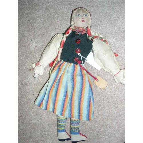 This is a 15" cloth doll. She has blonde string hair. It needs some help. She has a stockinette face with stitched features. There are a couple of holes in the vest. She has a couple of areas wearing thin in the skirt. She has mitten type hands and black thread to form fingers. She has a separate thumb. If you can enjoy her, please bid. She is from a smoke free environment. Buyer to pay $15 for U.S. shipping, insurance, and handling. Thanks for viewing.