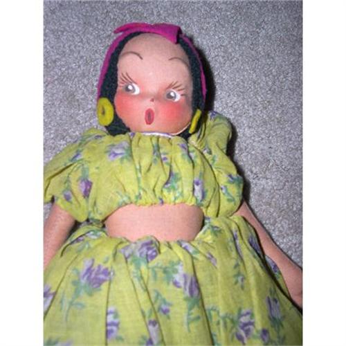 Here is a cloth molded face doll dressed as a Cuban girl. You don't see that many dolls to represent the country of Cuba. She has black yarn for her hair and felt for her earrings and headband. I see a couple of holes in the plum color headband. She has a cute gathered ruffle skirt and a puffed sleeve top. You can see her stomach. She has a lace trimmed half slip and boxer type panties. She has sandal type shoes. She has the o shaped mouth and brown eyes. She's nice and clean and will look great on your shelf. She is from a smoke free environment. If you can love her, please bid. Buyer to pay $10 for U.S. shipping, insurance, and handling. Thanks for viewing.