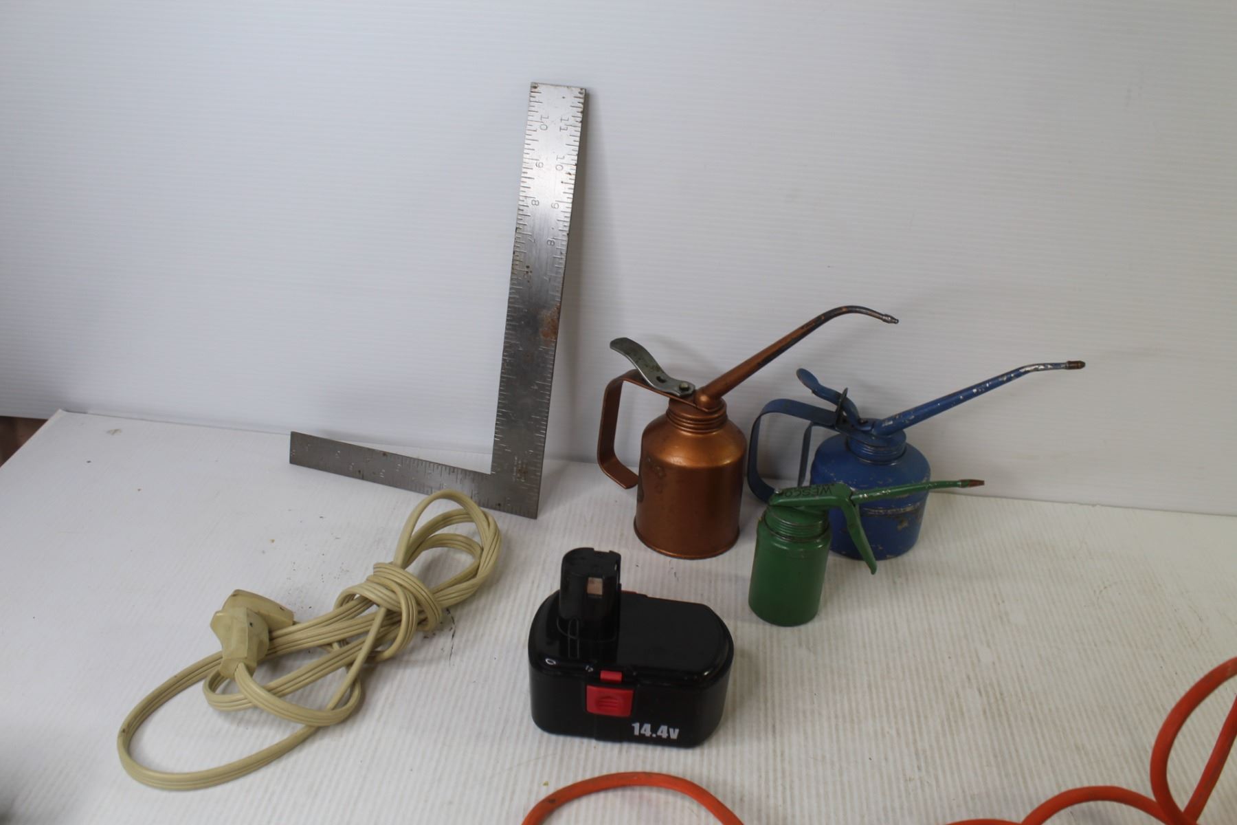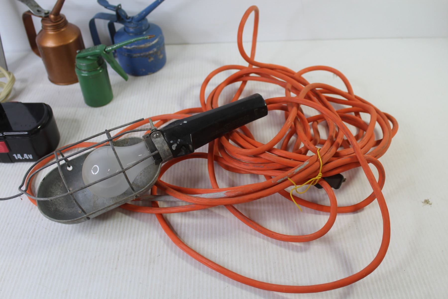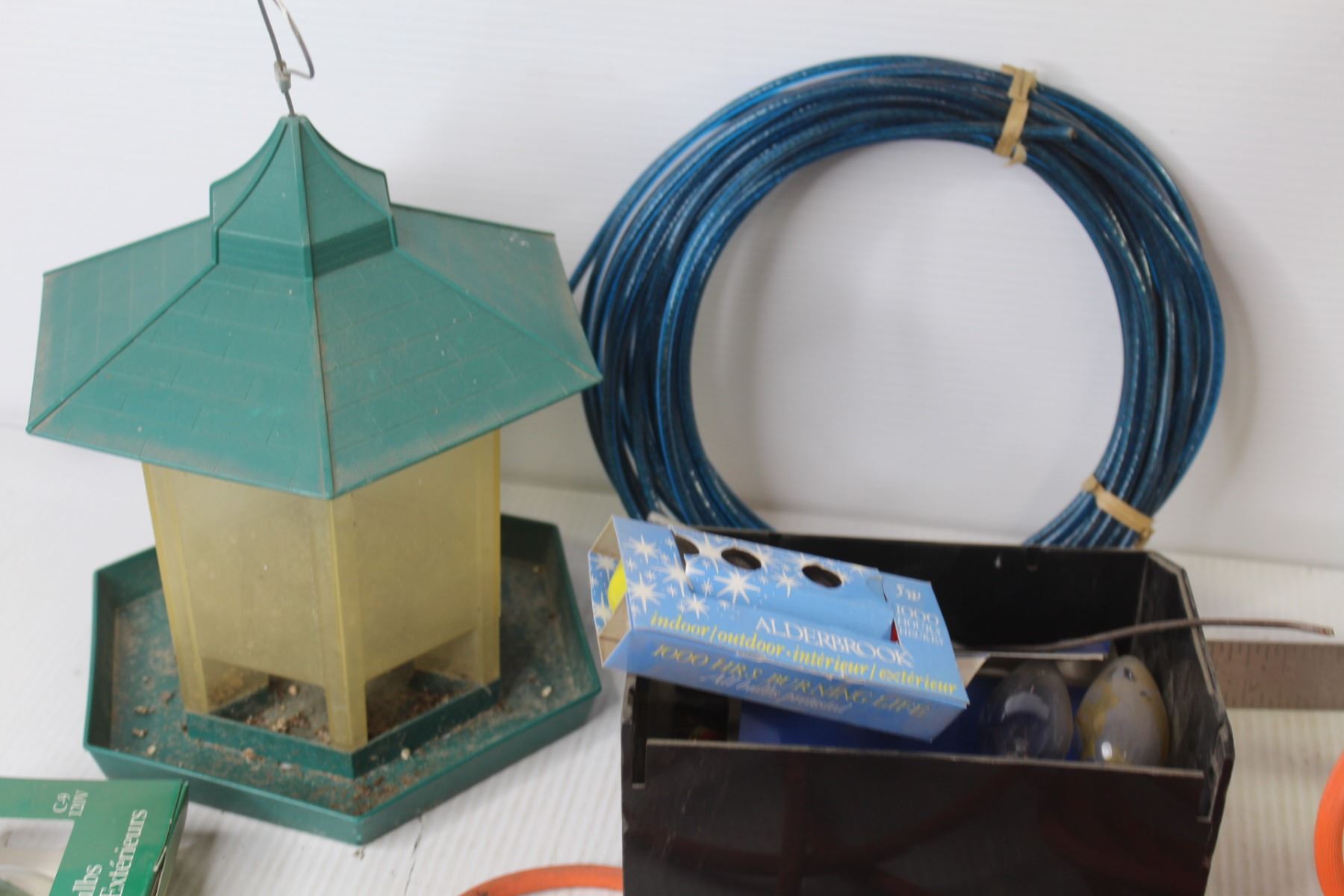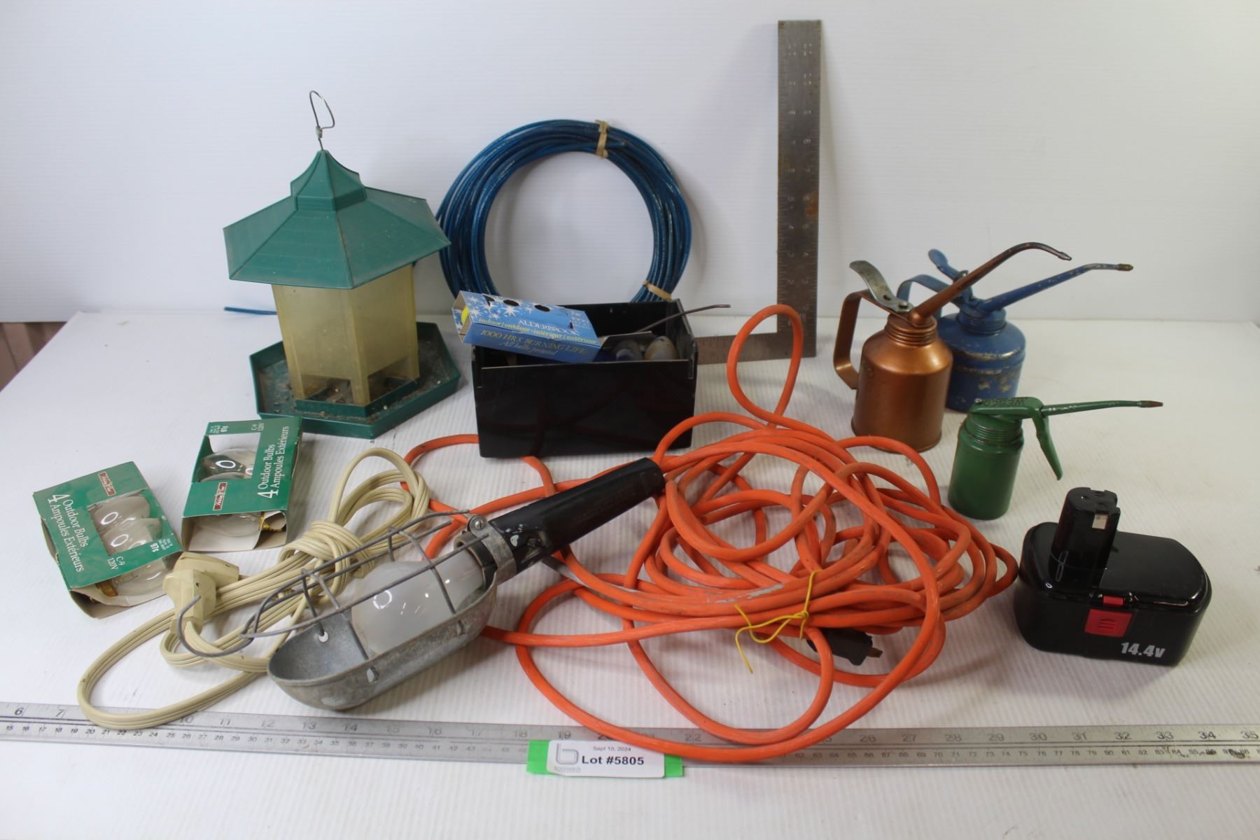 Clothes Line Wire - Trouble Light - 12" Square - (3) Oiler Cans - Bird Feeder - Extension Cord - Misc. Items