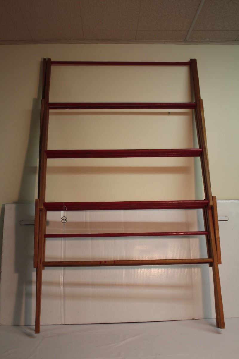 A tall wooden clothes rack